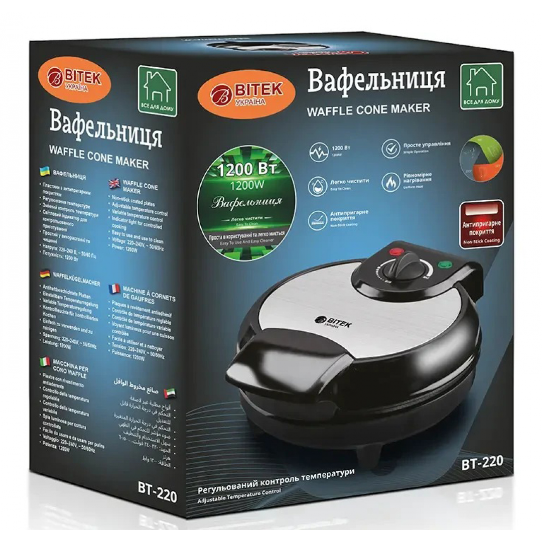 Вафельница BITEK BT-220 предназначена для приготовления ароматных и хрустящих вафель в домашних условиях. С ее помощью можно готовить как классические вафли, так и разнообразные десерты — от многослойных тортов до сладких рожков для мороженого. В комплекте предусмотрена удобная конусная форма для быстрого создания вафельных рожков.