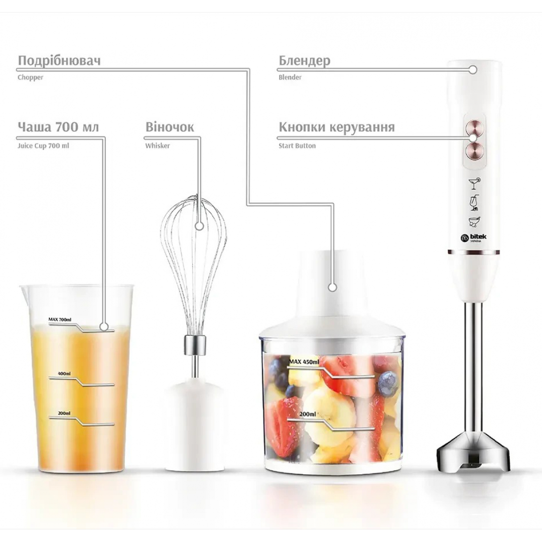 BITEK BT-272W – это универсальный кухонный набор «4 в 1», который сочетает в себе функции блендера, измельчителя, венчика и стакана для приготовления напитков. Благодаря высокой мощности и надежным лезвиям из нержавеющей стали, он легко справляется с измельчением, смешиванием и взбиванием различных продуктов.