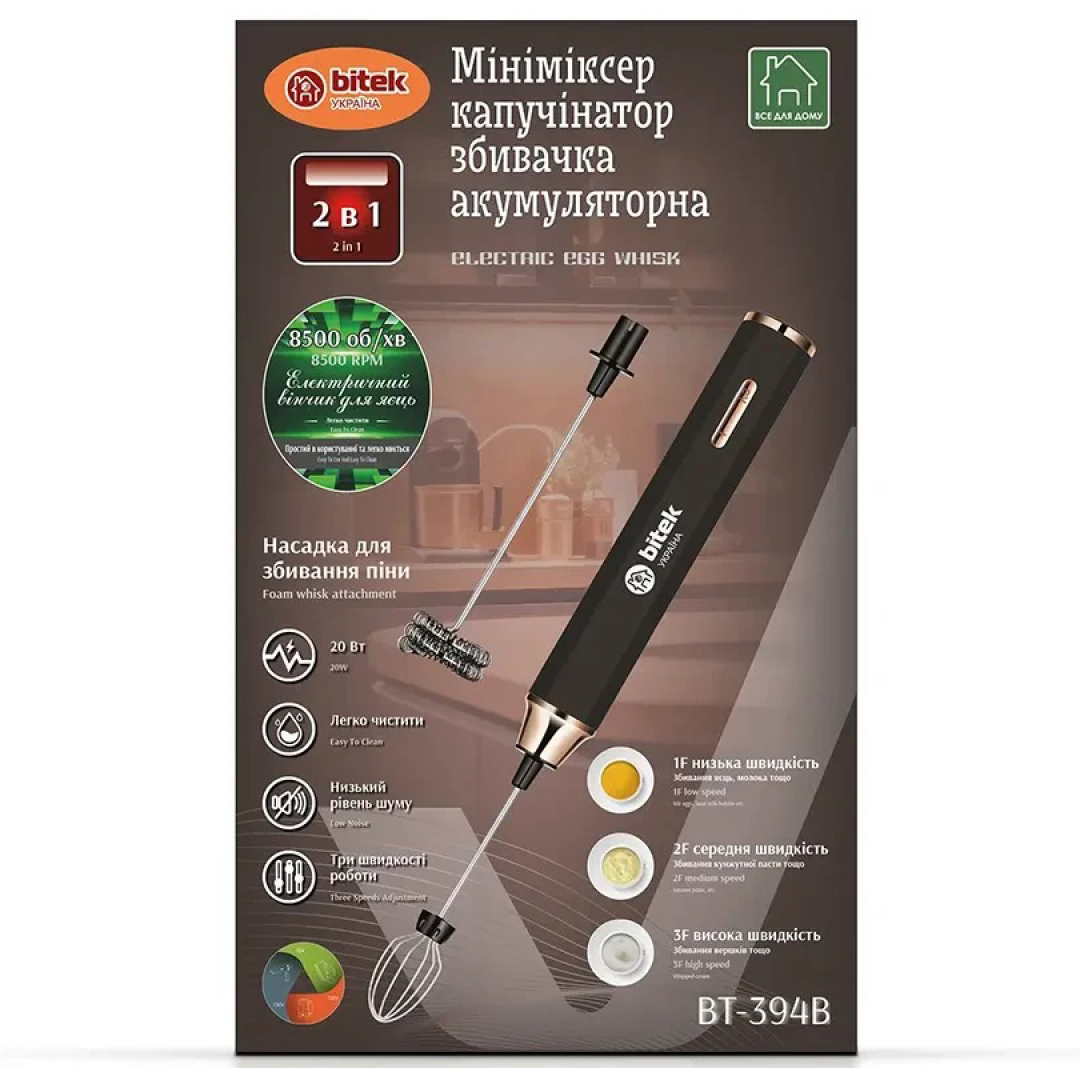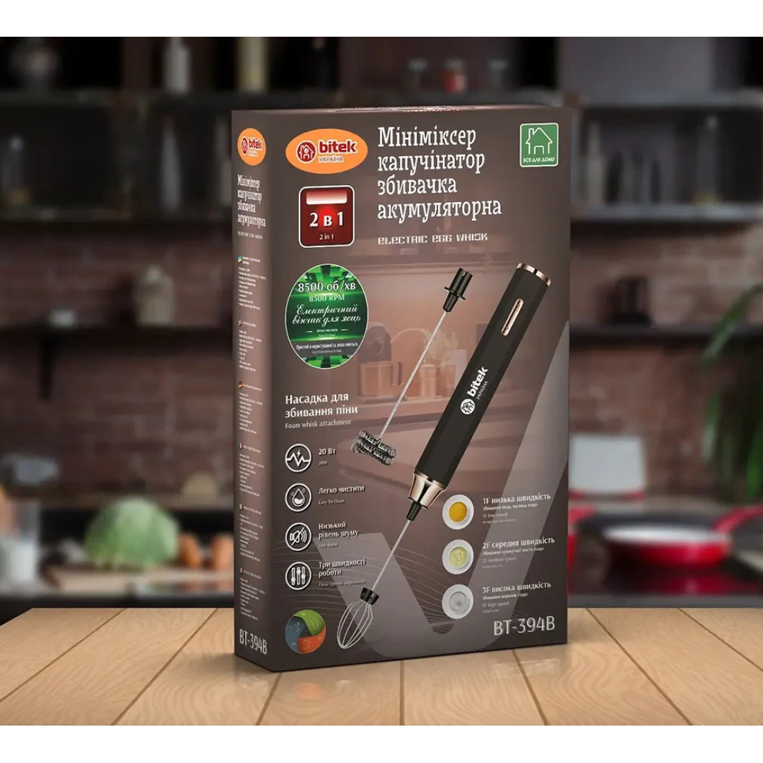 BITEK BT-394B – это компактный и удобный мини-миксер, который идеально подходит для взбивания яиц, приготовления кофе с пышной пенкой, соусов и других кулинарных задач. Благодаря встроенному аккумулятору и тихой работе, прибор удобен в использовании как дома, так и в дороге.