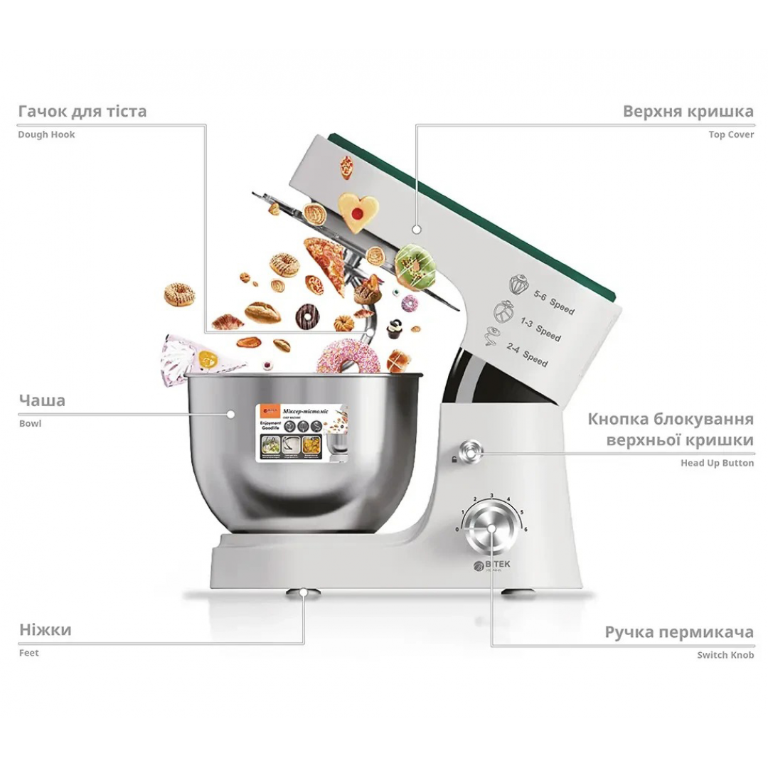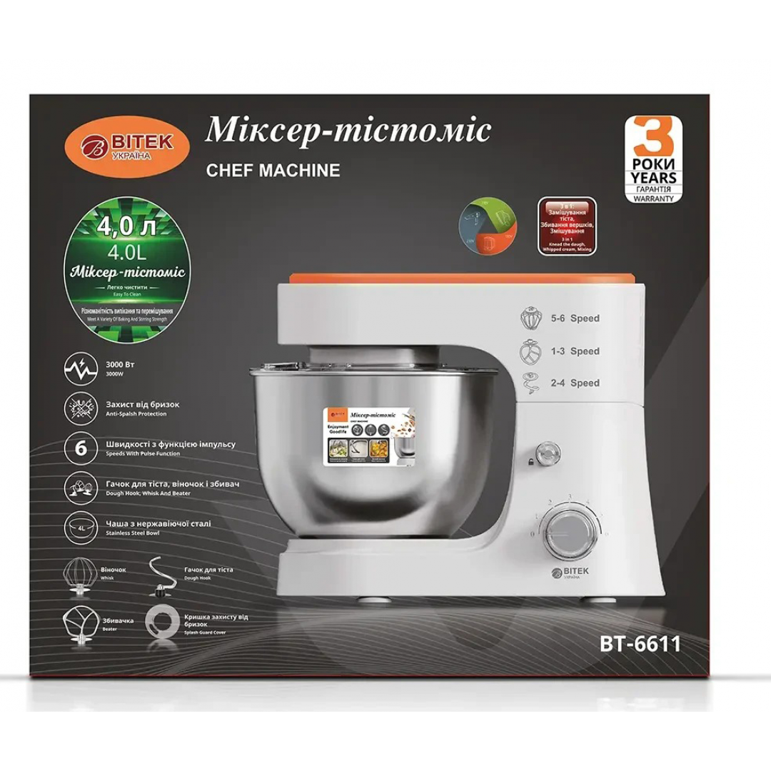 Стационарный планетарный миксер-тестомес BITEK BT-6611, 3000 Вт, чаша 4 л