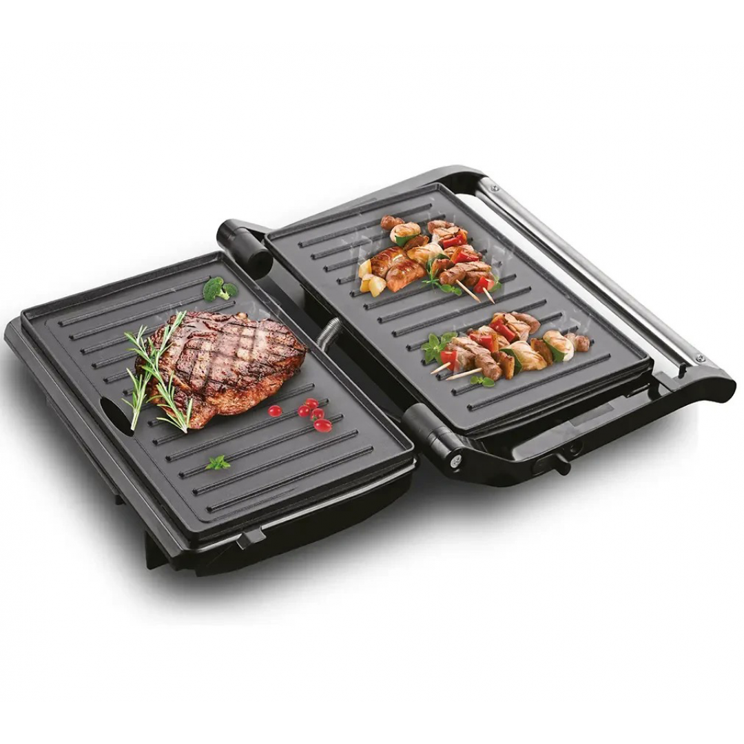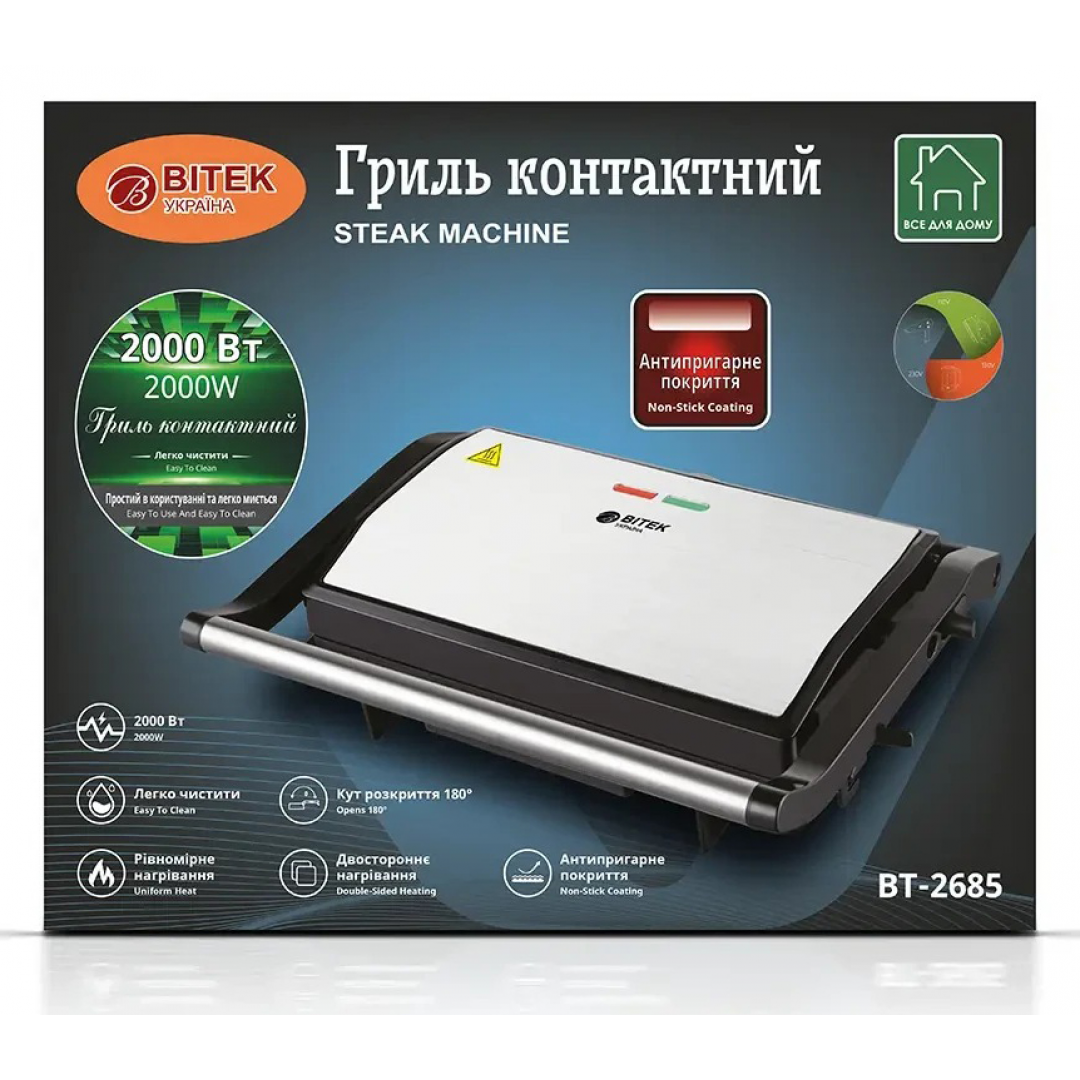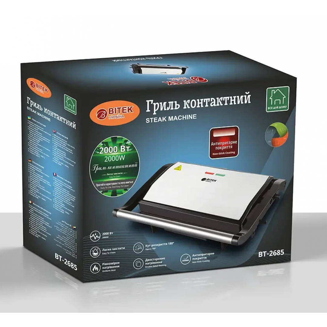 Контактный гриль BITEK BT-2685 — это компактный и мощный прибор, который идеально подойдет для приготовления горячих бутербродов, стейков, овощей, яиц и других блюд в домашних условиях. Благодаря мощности 2000 Вт он быстро нагревается и обеспечивает равномерное приготовление. Возможность раскрытия на 180° превращает его в полноценный барбекю-гриль, позволяя готовить большие порции.