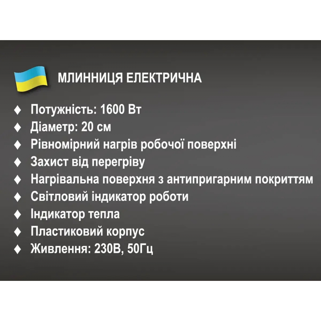 Прибор оснащён индикатором нагрева, кнопкой включения на корпусе и прорезиненными ножками для устойчивости. В комплект входит удобная пластиковая ёмкость для теста и деревянная лопатка для переворачивания блинов.