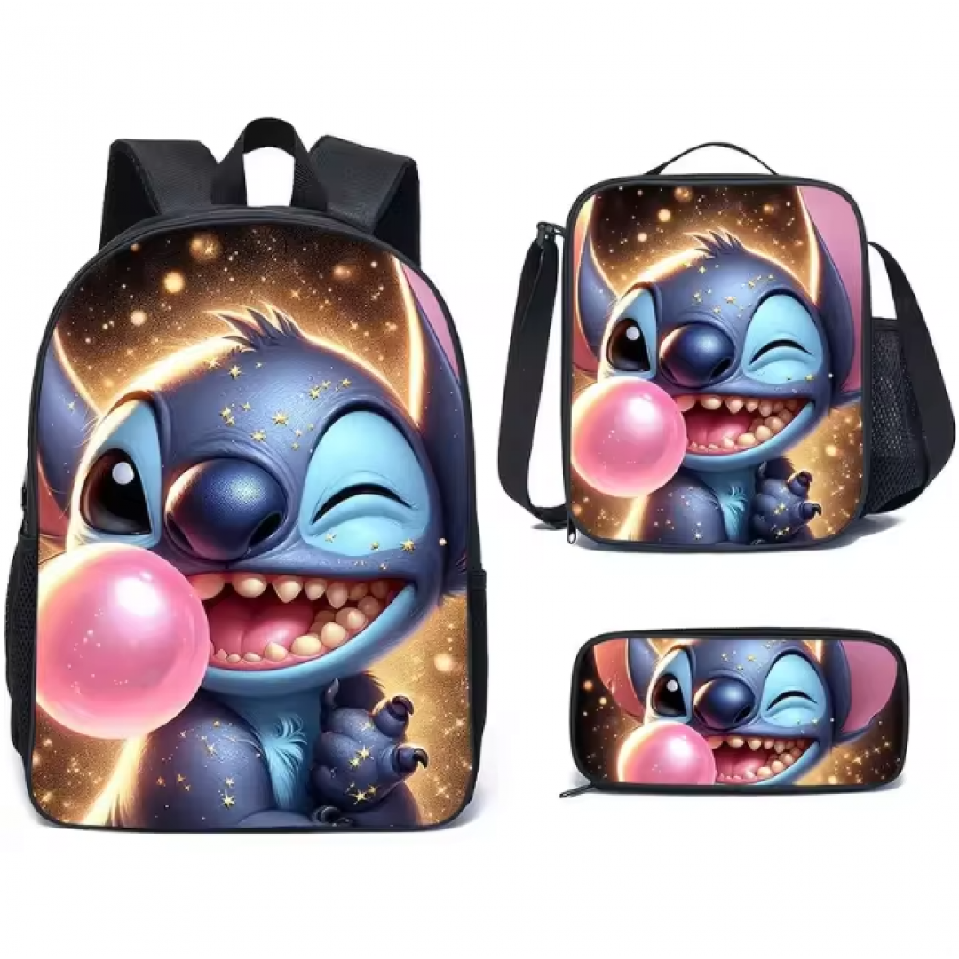 Набор из трёх предметов с ярким дизайном персонажа Stitch. Комплект состоит из вместительного рюкзака, небольшой сумки и пенала. Подходит для школы, прогулок, поездок и повседневного использования.