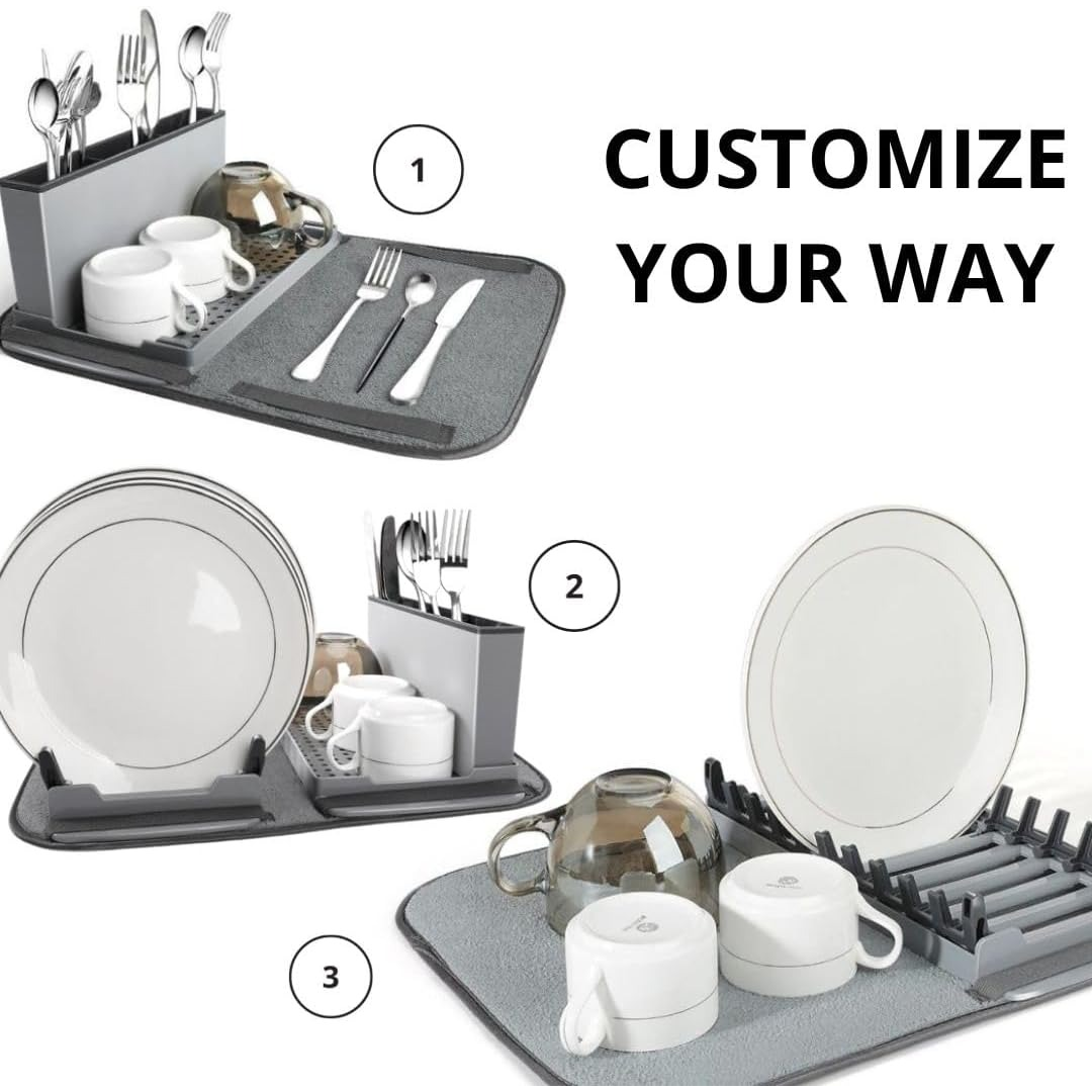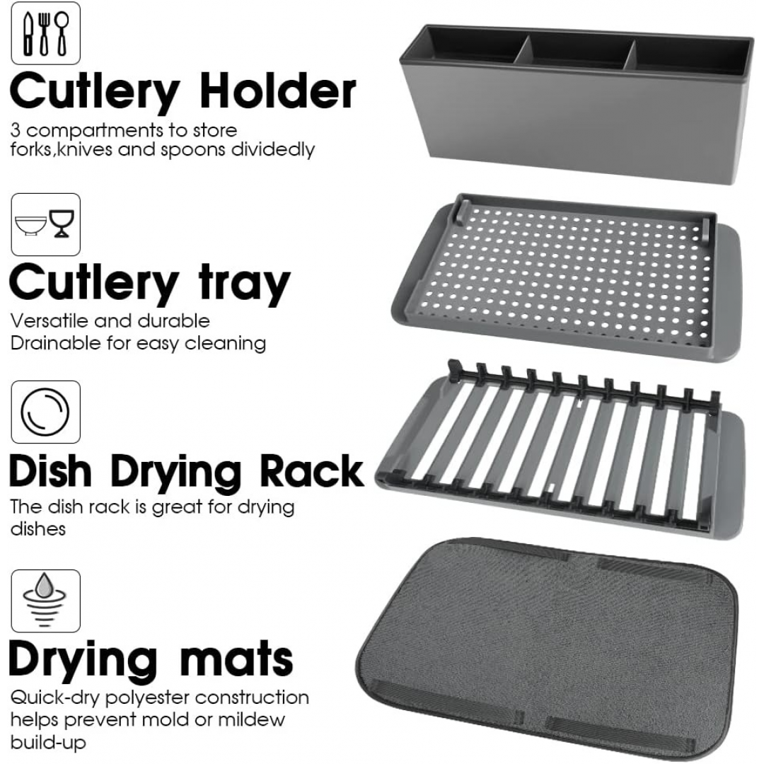 Современная сушилка для посуды с дренажной системой 360° — это практичное решение для организации пространства на кухне. Конструкция сочетает в себе подставку для тарелок, поддон для стекания воды, держатель для столовых приборов и влаговпитывающий коврик. Всё продумано до мелочей, чтобы сохранить чистоту и порядок.