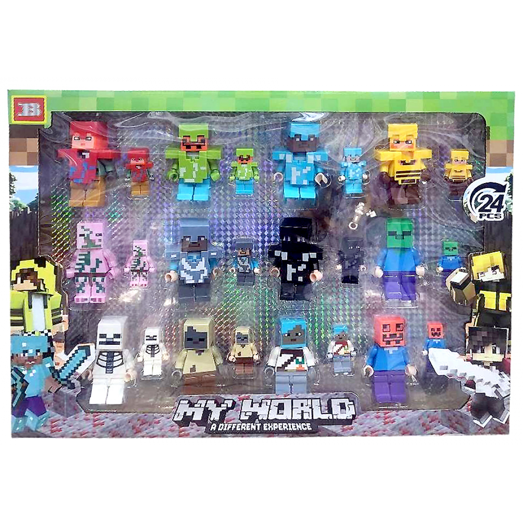Игровой набор, включающий 24 минифигурки персонажей и существ из мира Minecraft. В комплекте представлены разнообразные герои, монстры и мобы — от Стива и Алекса до скелетов, зомби и големов. Все фигурки выполнены в кубическом стиле игры и совместимы с LEGO-конструкторами.