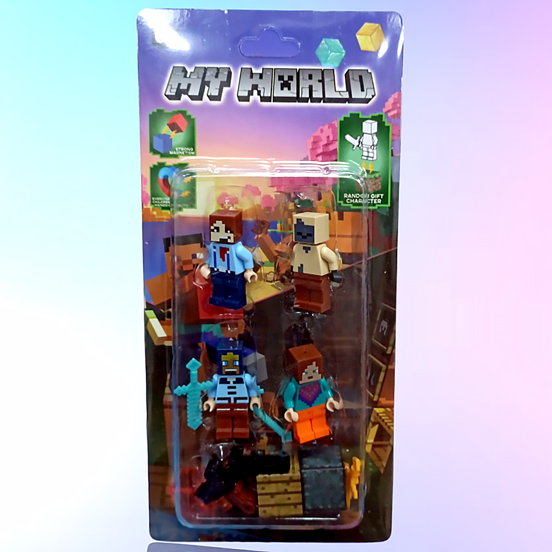 Набор из 4 минифигурок по мотивам игры Minecraft в стиле LEGO. В комплект входят персонажи с различными выражениями лиц и аксессуарами — мечами и кирками, что позволяет воссоздавать сцены из игры и придумывать новые истории.