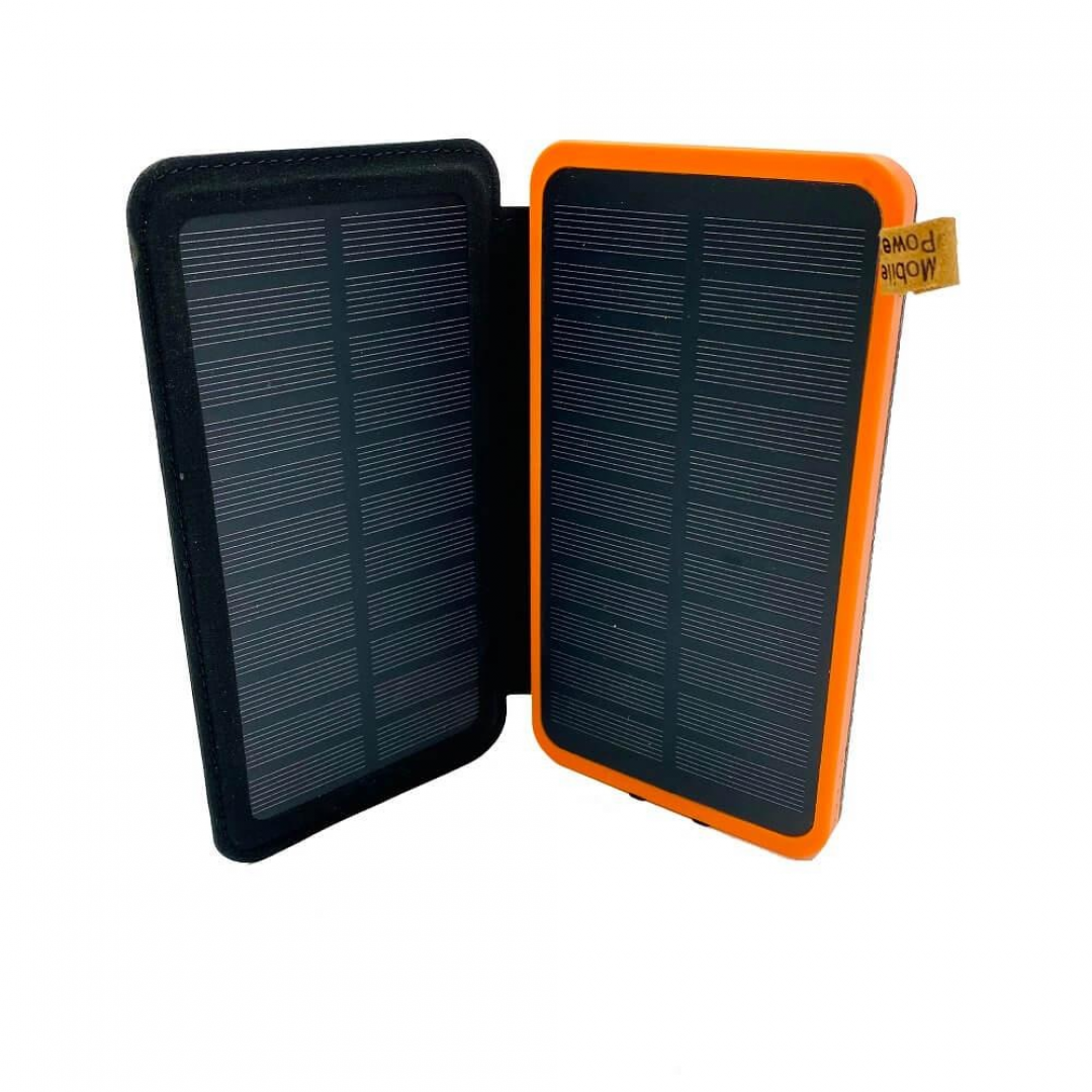Портативный повербанк с солнечной подзарядкой оснащён двумя встроенными солнечными панелями, которые обеспечивают дополнительный источник энергии при нахождении на солнечном свете. Складная конструкция позволяет удобно переносить устройство и защищает панели во время транспортировки.