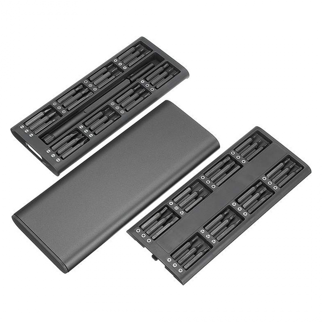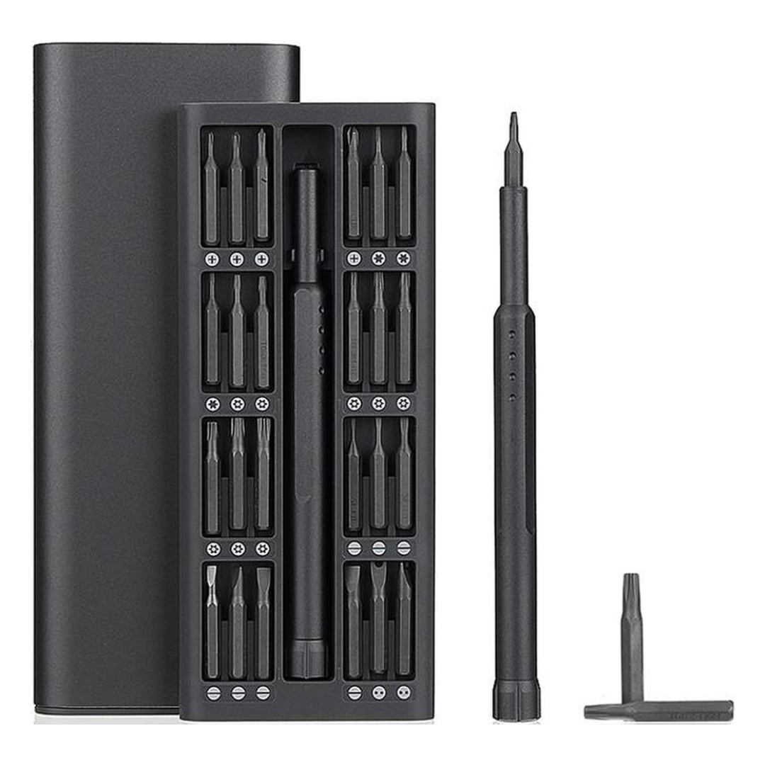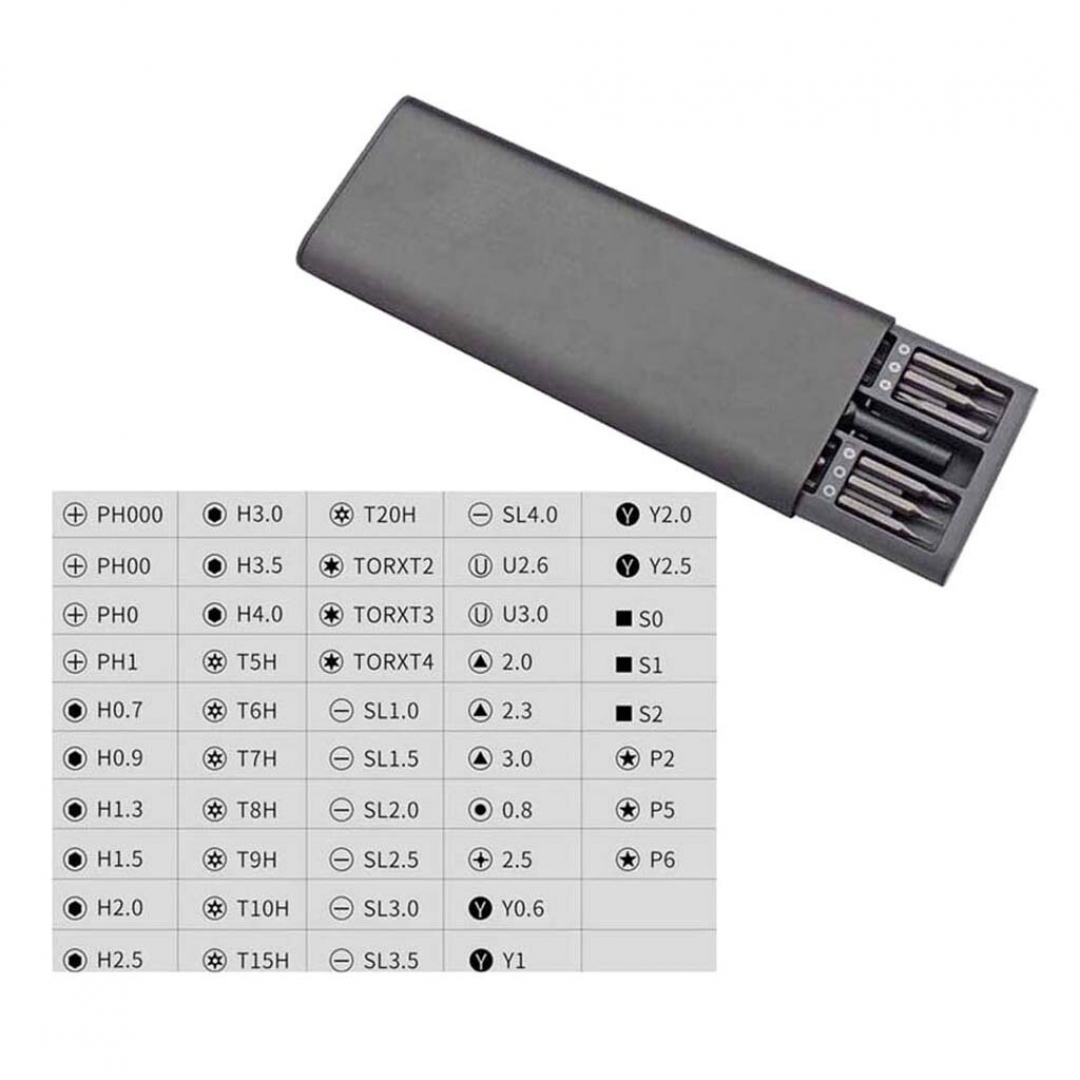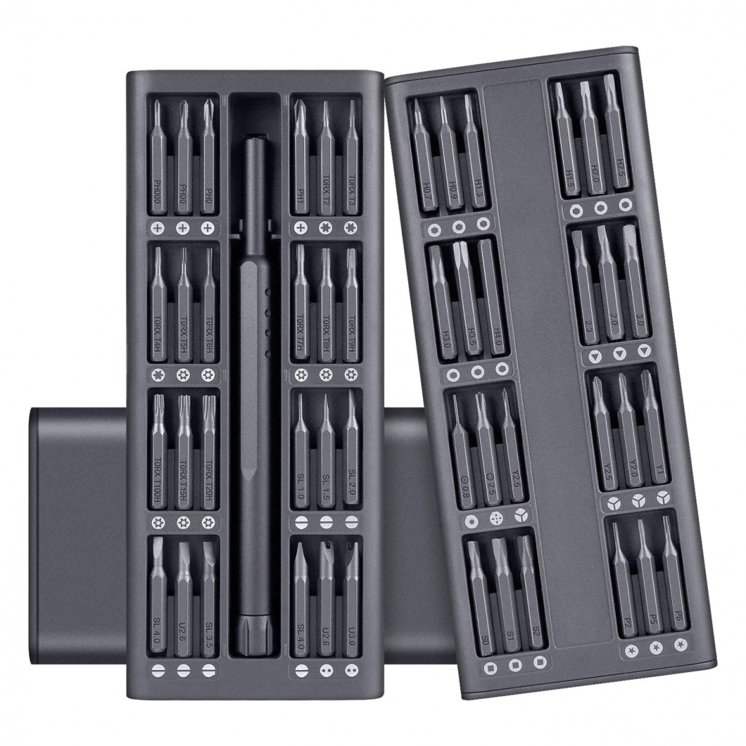 Набор состоит из универсальной ручки-отвёртки и 48 сменных магнитных микробитов, размещённых в компактном выдвижном футляре. Комплект предназначен для точечных ремонтных работ и подходит для обслуживания электроники, мобильных устройств, часов, очков, бытовых приборов и мелких механизмов. Биты фиксируются магнитом, что обеспечивает удобство и устойчивость при работе.