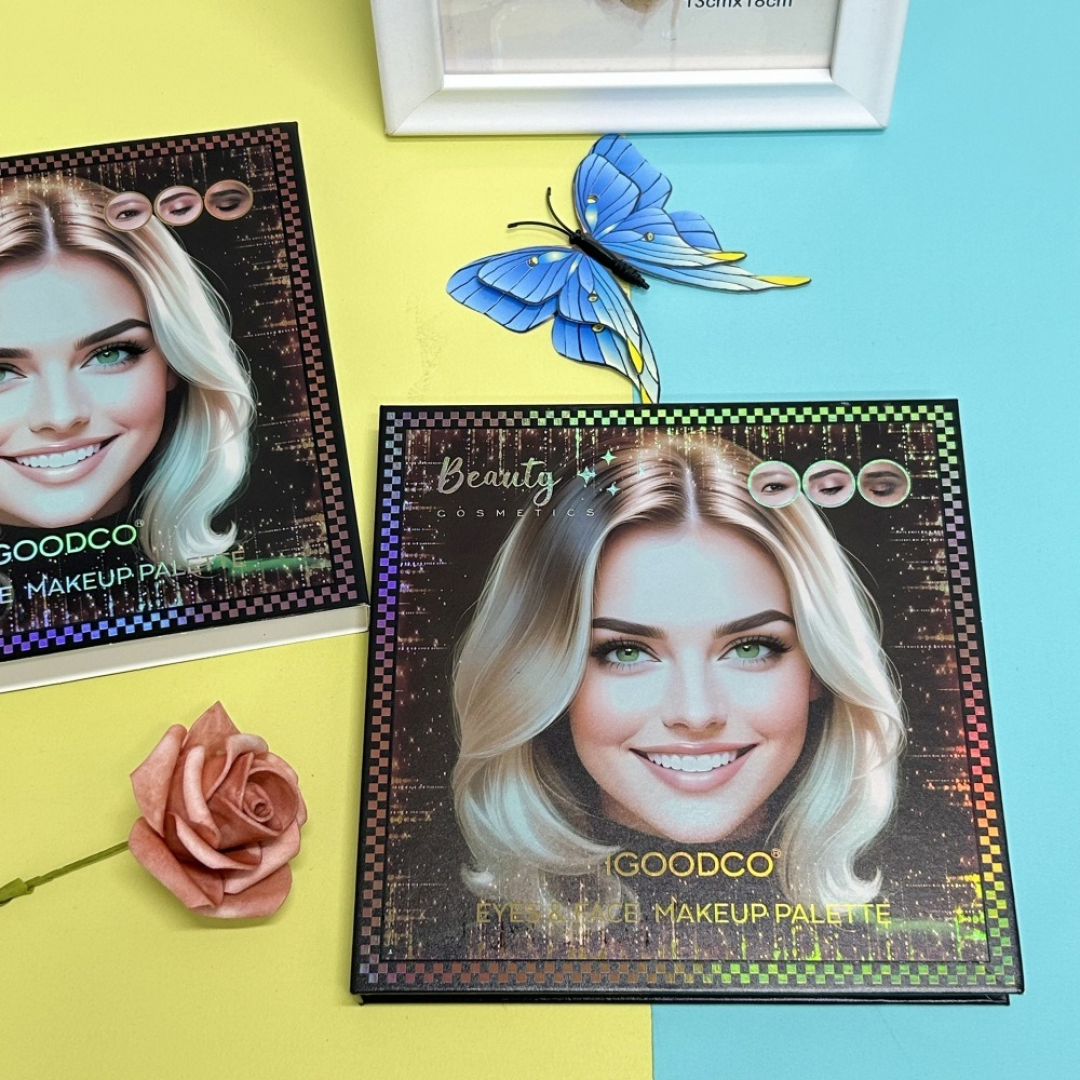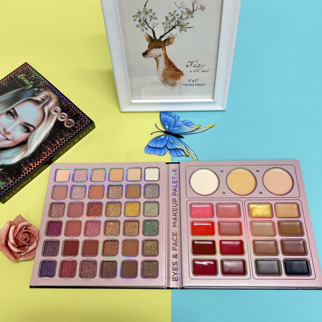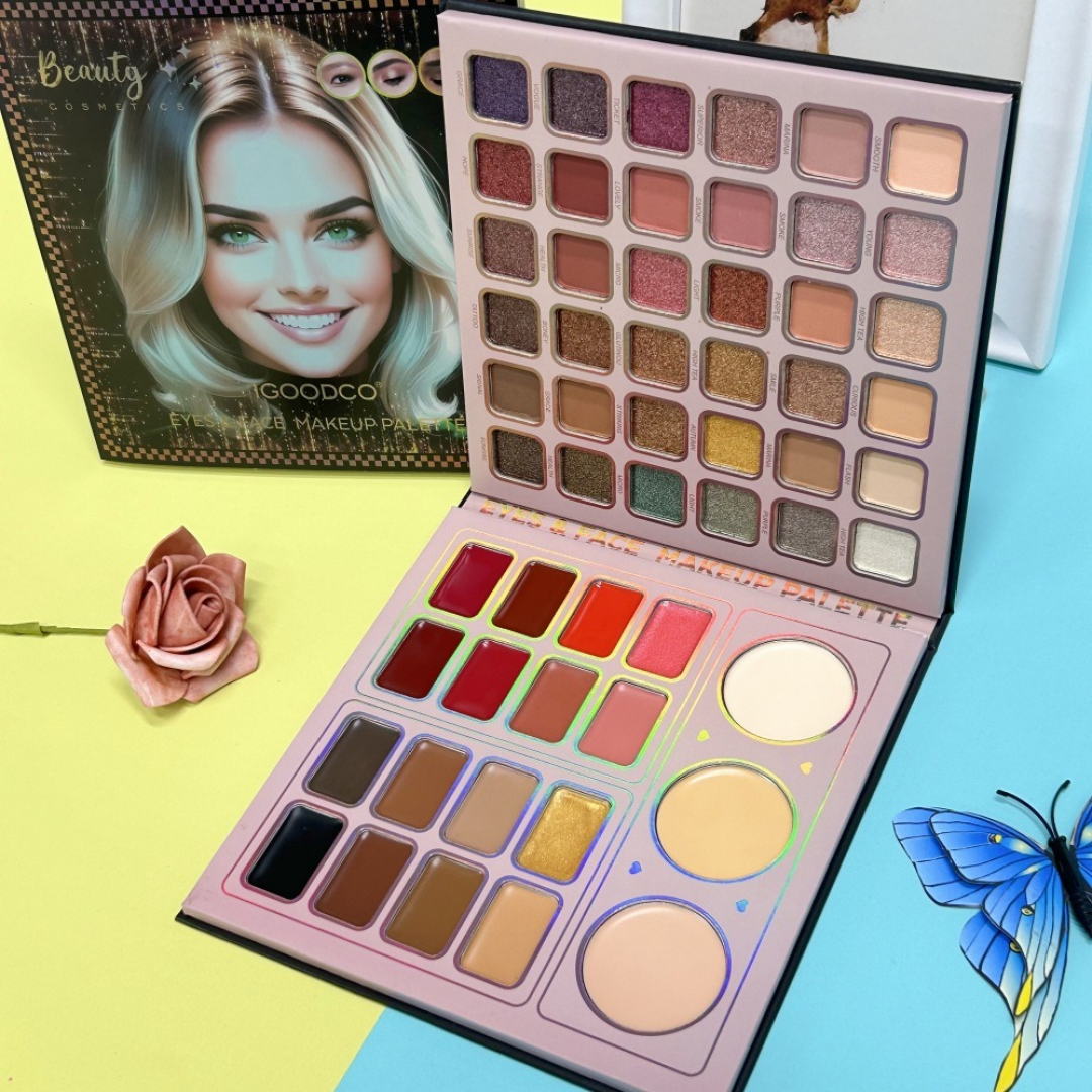 Палетка включает матовые и глиттерные тени для век, средства для коррекции тона, продукты для губ, а также элементы для подсветки и контуринга лица. Формат набора удобен для хранения и использования дома.