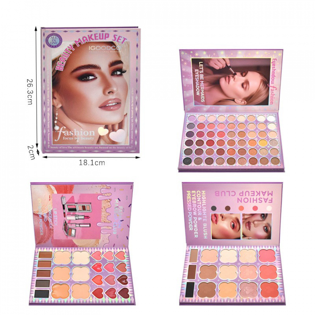 В наборе представлены тени для век с матовыми и сияющими текстурами, а также средства для макияжа лица и губ. Структура палетки позволяет последовательно использовать продукты для глаз, коррекции тона, контуринга и оформления губ, что делает набор удобным для домашних экспериментов с макияжем.