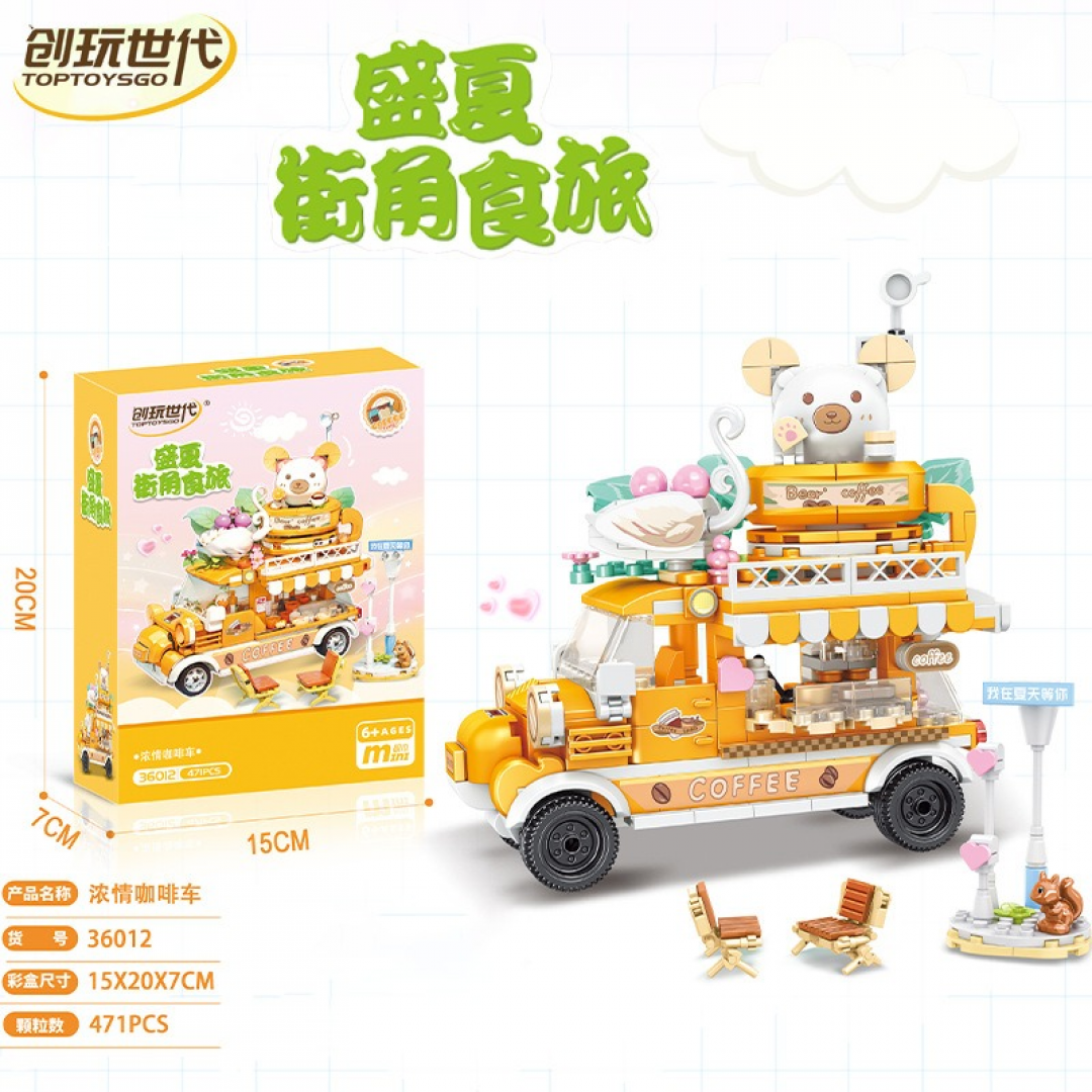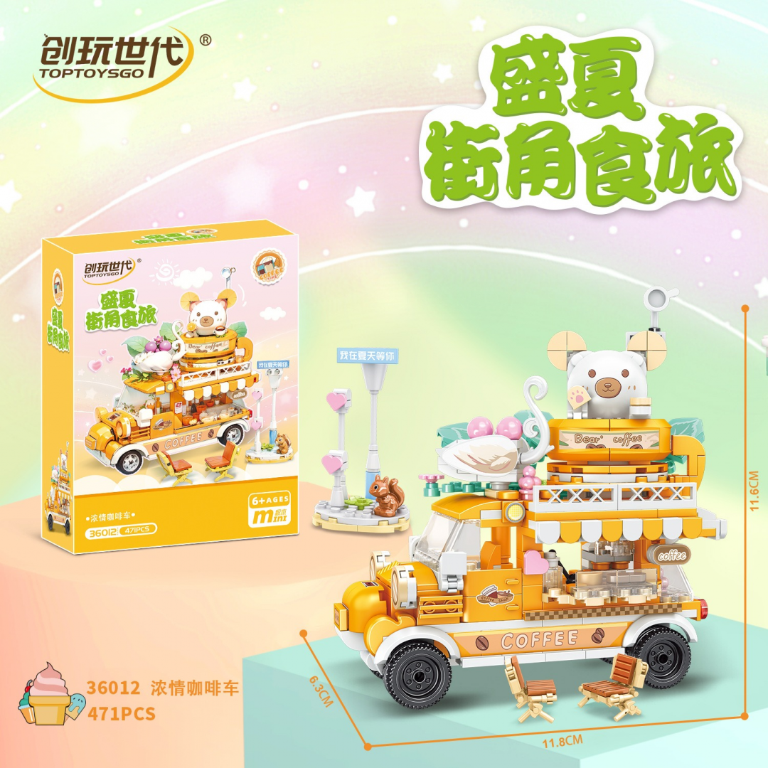 Конструктор представляет собой сборную модель уличного кофейного фургона, оформленного в ярком тематическом стиле. Модель выполнена в виде мобильной кофейни с торговой зоной, декоративными элементами и аксессуарами, создающими атмосферу летнего кафе.