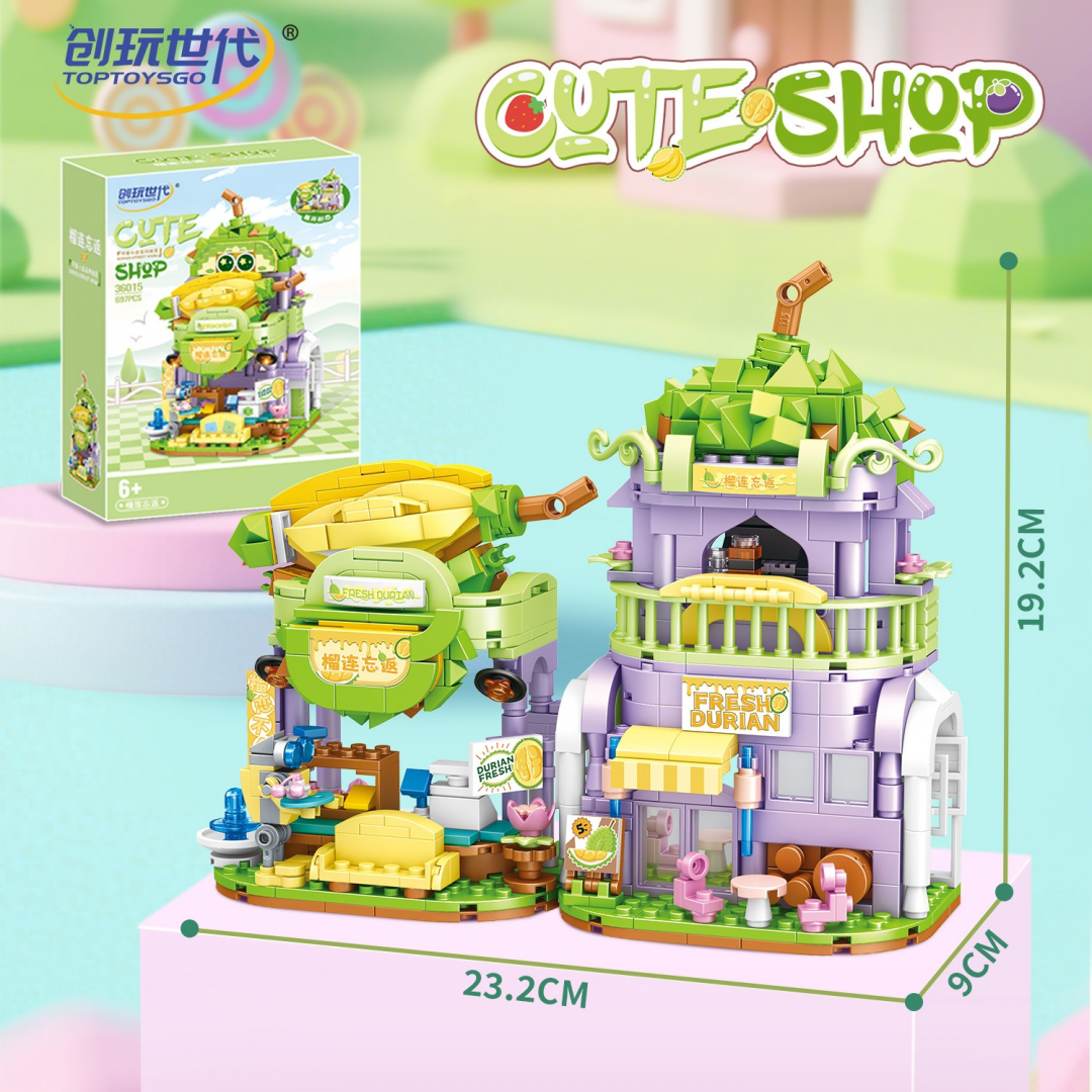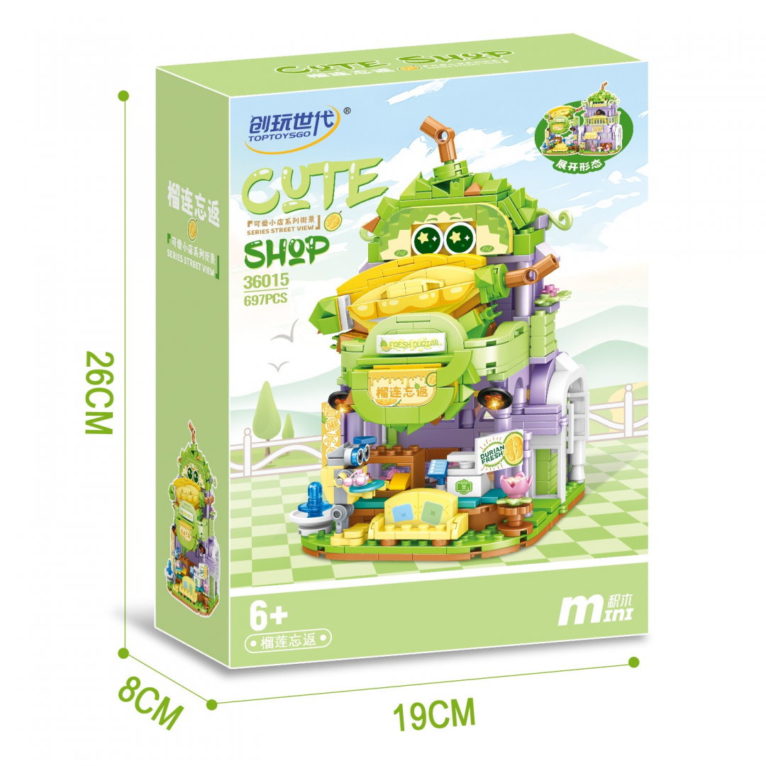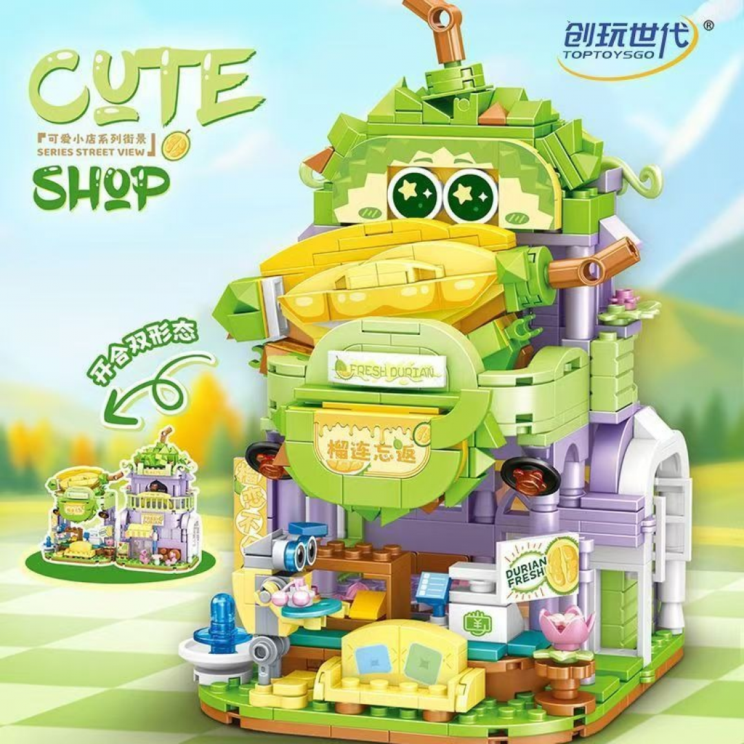 Конструктор представляет собой сборную модель тематического магазина в виде здания, стилизованного под фрукт дуриан. Модель выполнена в формате уличной лавки с фасадом, витриной и декоративными элементами, создающими цельный архитектурный образ.