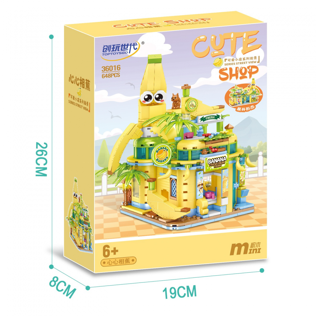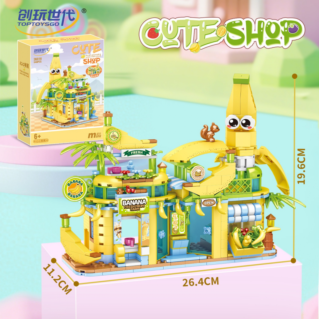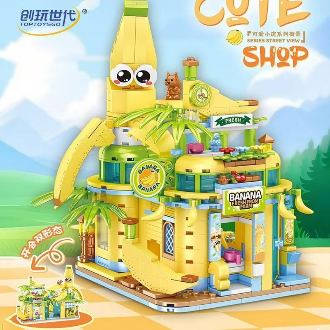 Конструктор представляет собой сборную модель тематического магазина, выполненного в виде яркого здания с банановой стилистикой. Архитектура включает многоуровневую конструкцию с витринами, вывесками и декоративными элементами, формирующими образ уличного фруктового магазина.