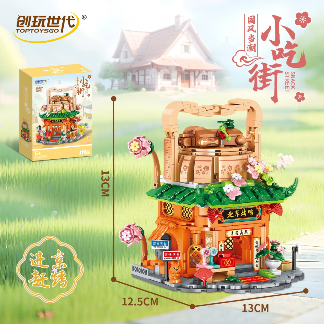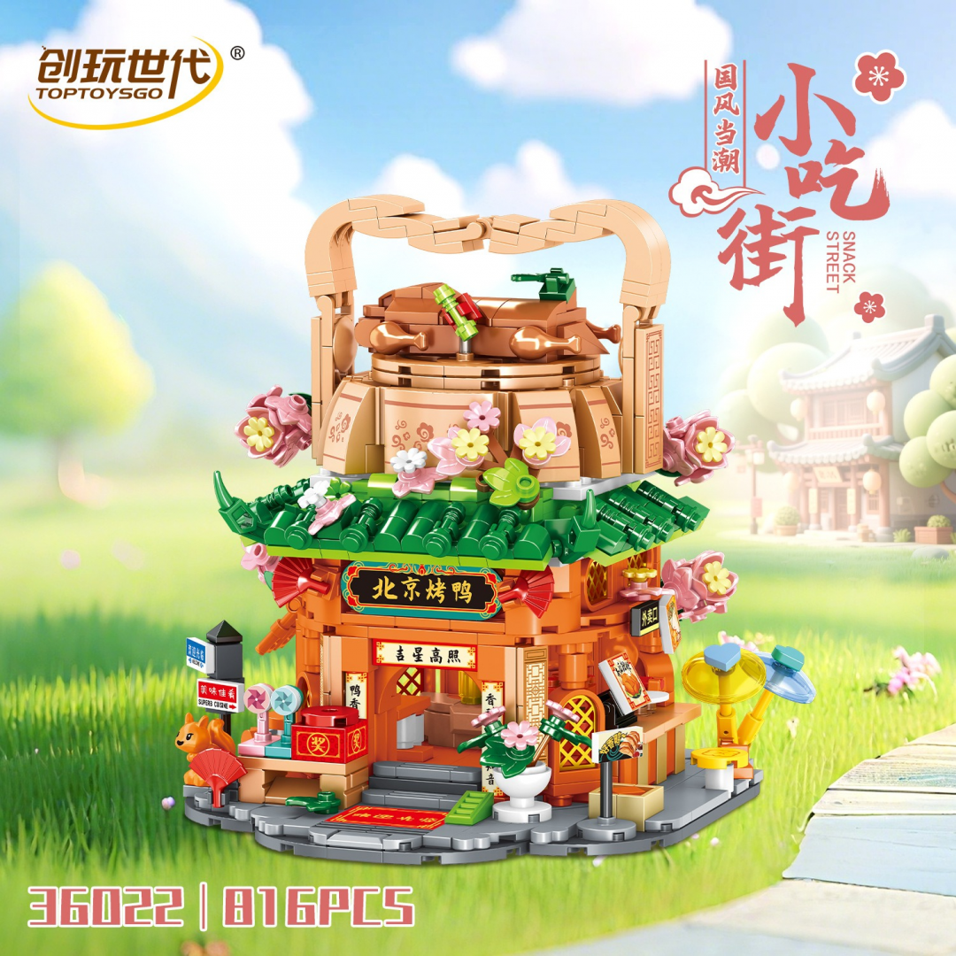 Конструктор представляет собой сборную модель кафе, специализирующегося на приготовлении пекинской утки, выполненную в стиле традиционной восточной уличной архитектуры. В процессе сборки формируется двухуровневое здание с прилавком, декоративной крышей, вывесками и тематическими элементами, отражающими кулинарную направленность заведения.