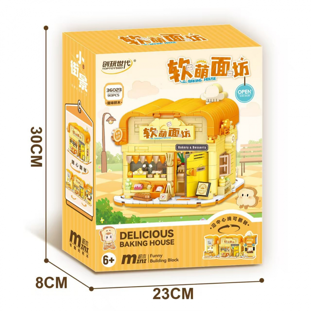 Модель выполнена в тёплой цветовой гамме и дополнена декоративными элементами, вывесками и аксессуарами, связанными с пекарским делом. Конструкция позволяет рассматривать как внешний облик, так и внутреннее пространство, что делает модель подходящей для сюжетной игры и коллекционного размещения.