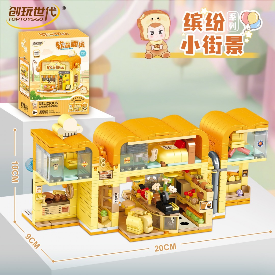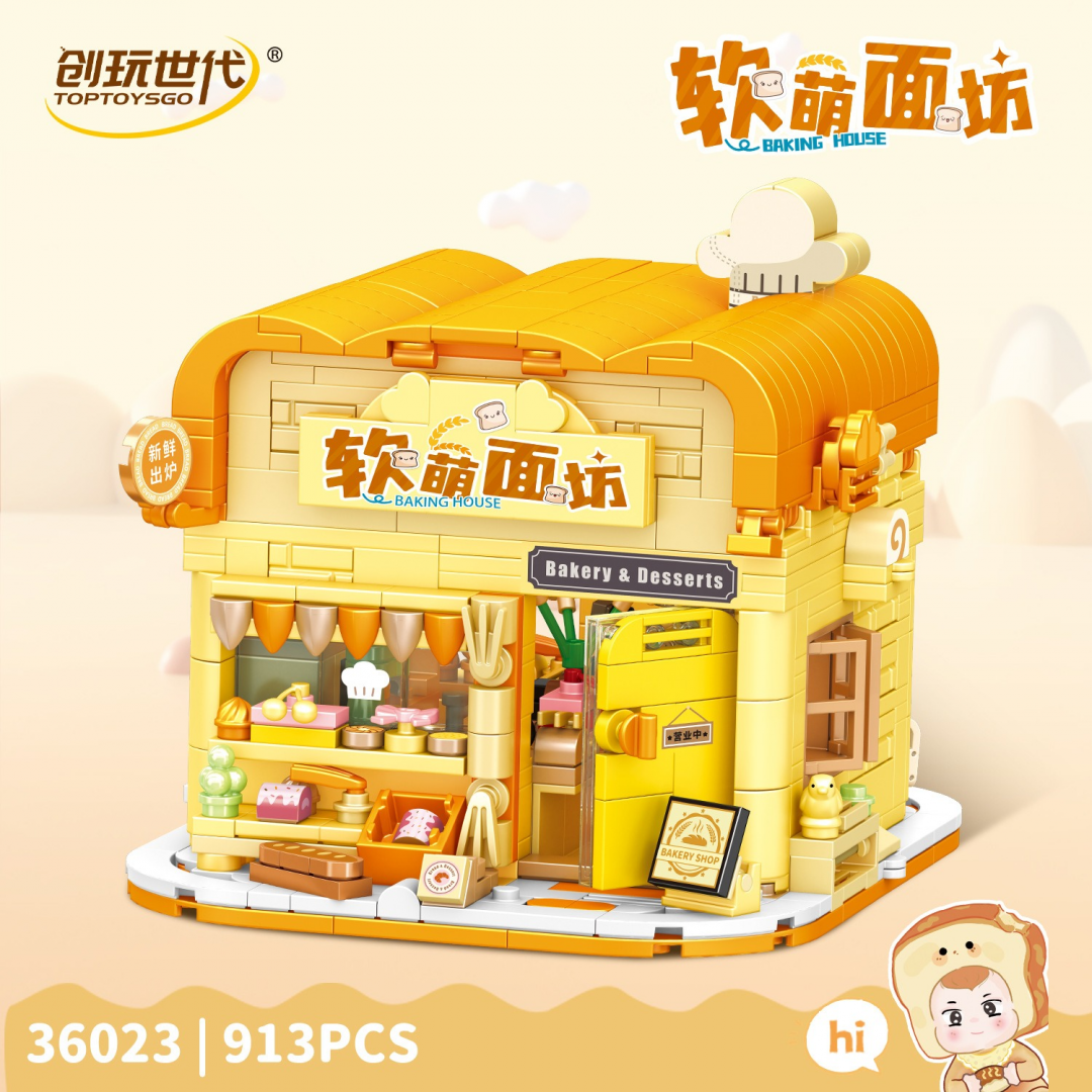 Конструктор представляет собой сборную модель пекарни с детально проработанным фасадом и внутренним интерьером. В процессе сборки формируется компактное здание с витриной, входной дверью, торговым прилавком и рабочей зоной, оформленной в тематике выпечки и десертов.