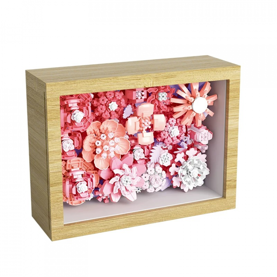 Фоторамка-конструктор «Розовые цветы» представляет собой декоративную объёмную композицию в формате рамки с цветочной инсталляцией, выполненной из отдельных элементов конструктора. Внутренняя композиция оформлена в розово-белой цветовой гамме с высокой детализацией цветов и декоративных элементов.