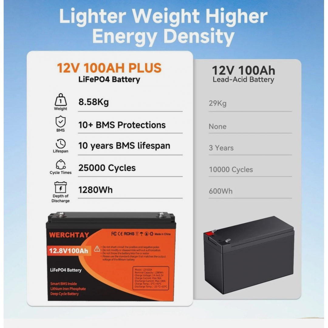 Литий-железо-фосфатный аккумулятор Werchtay предназначен для хранения и использования электроэнергии в автономных и резервных системах питания с номинальным напряжением 12 В. Подходит для солнечных электростанций, кемперов, лодок, автономных энергетических систем и других установок, требующих стабильного источника питания.