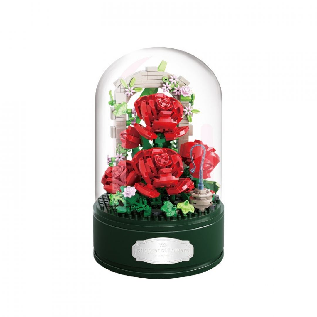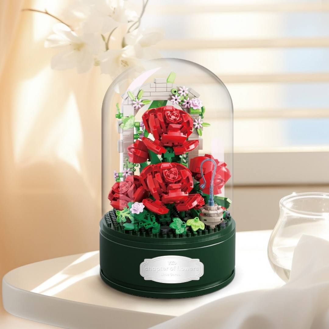 Композиция выполнена в форме цветочной сцены с несколькими красными розами, зелёной листвой и декоративными элементами. Все детали устанавливаются на устойчивое основание и закрываются прозрачным куполом, который защищает модель от пыли и придаёт законченный внешний вид. Конструктор собирается по инструкции и не требует дополнительного ухода после сборки.
