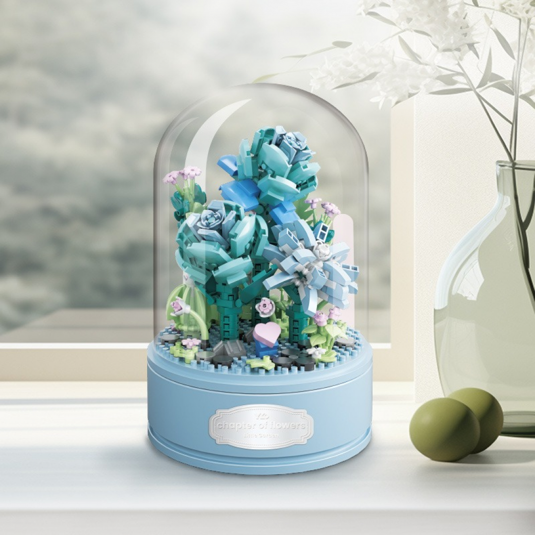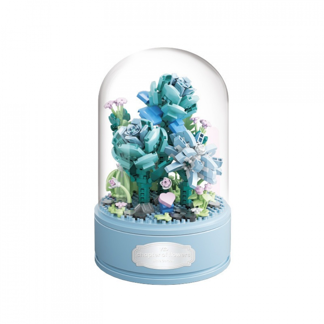 Декоративный конструктор с цветочной композицией из голубых роз, размещённой под прозрачным куполом. Модель предназначена для сборки и дальнейшего использования в качестве интерьерного элемента.