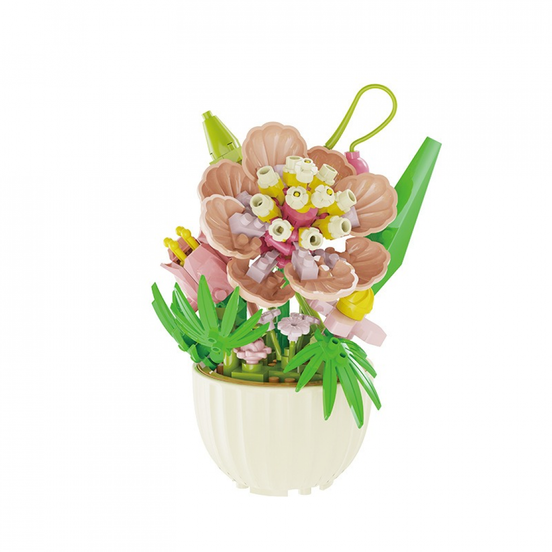 Конструктор представляет собой цветочную композицию в светлом горшке с детализированным бутоном, листьями и стеблями. После сборки изделие формирует завершённую декоративную модель, подходящую для размещения на столе, полке или подоконнике. Конструкция устойчивая, все элементы фиксируются между собой.