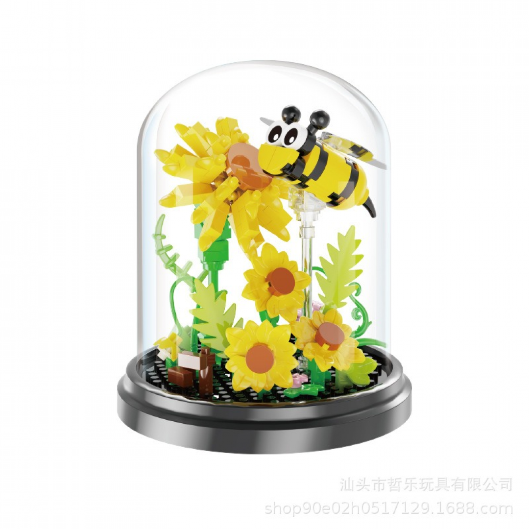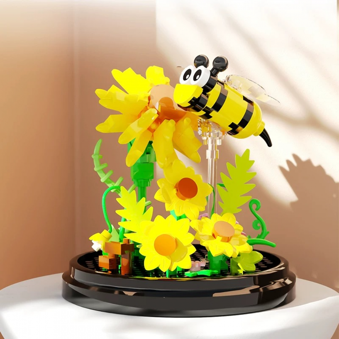 Декоративный конструктор в виде композиции с хризантемами и пчёлами, размещённой под прозрачным куполом. После сборки модель представляет собой интерьерный элемент с устойчивым основанием, подходящий для оформления полок, столов и витрин.