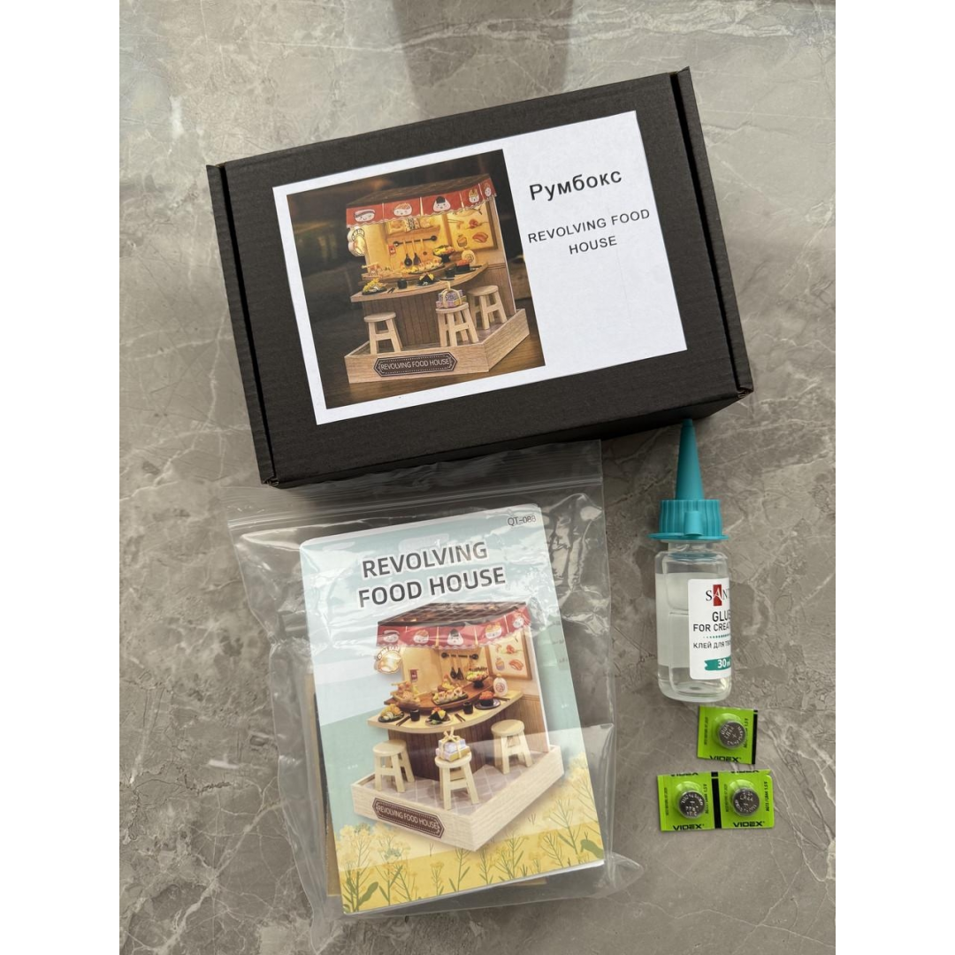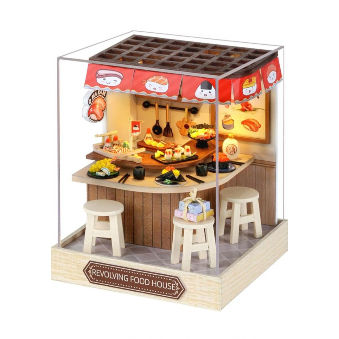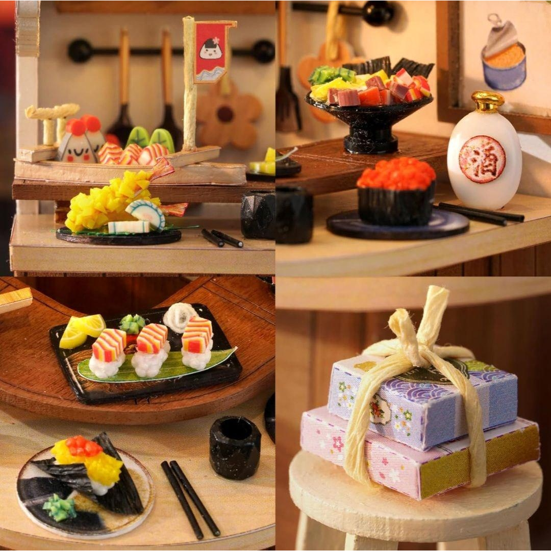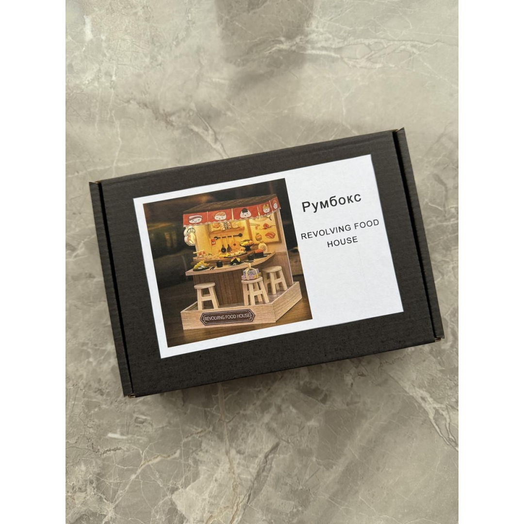 Румбокс «Суши-бар» — интерьерный 3D-конструктор для самостоятельной сборки миниатюрной композиции в японском стиле. Модель выполнена в виде небольшого суши-бара с детализированным интерьером, мебелью, декоративными элементами и тематическим оформлением, передающим атмосферу уютного заведения.