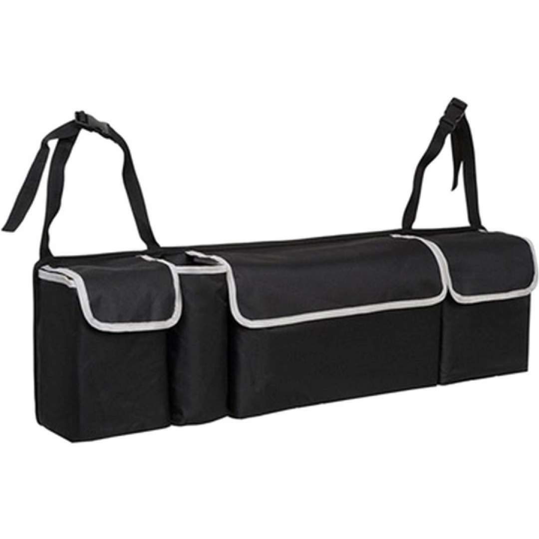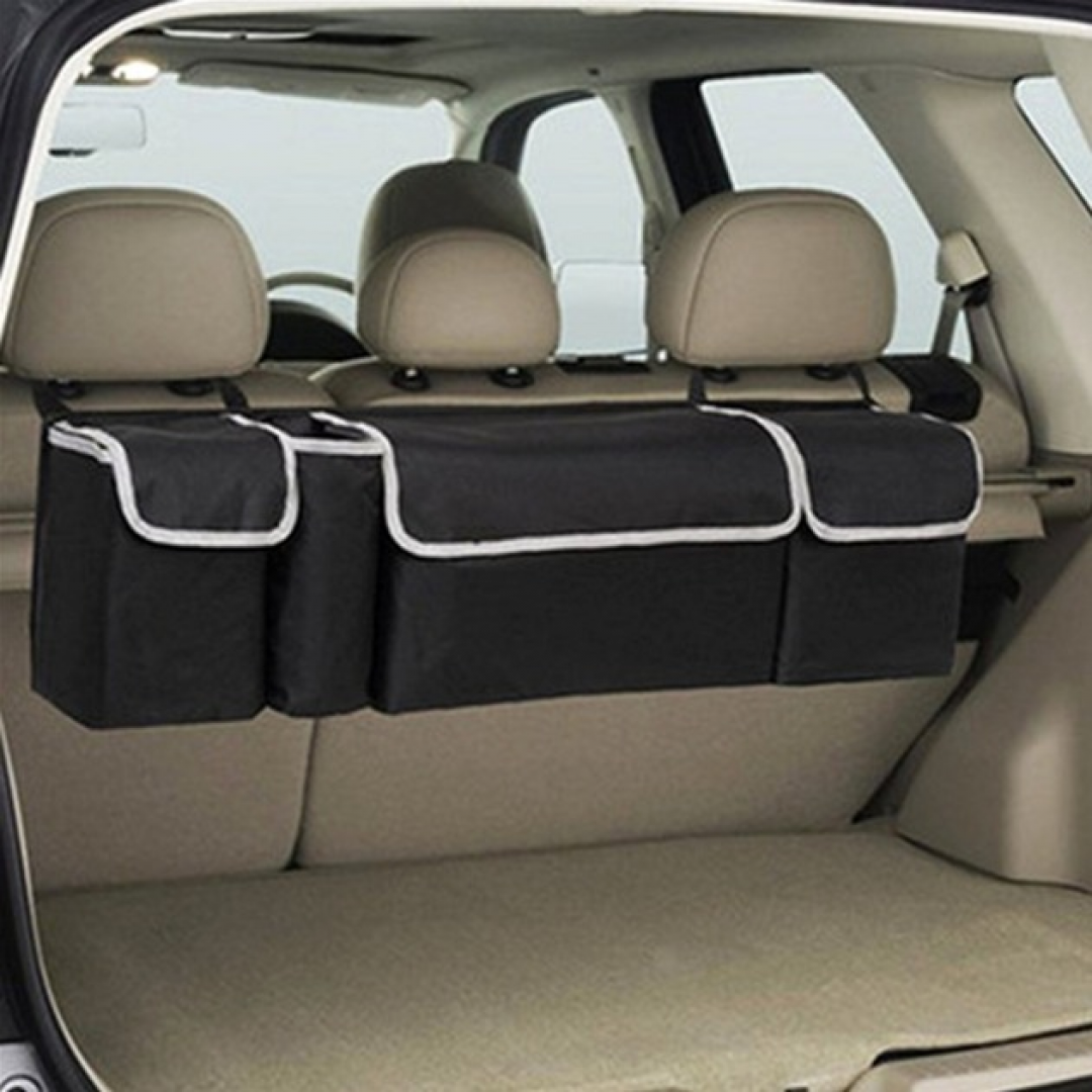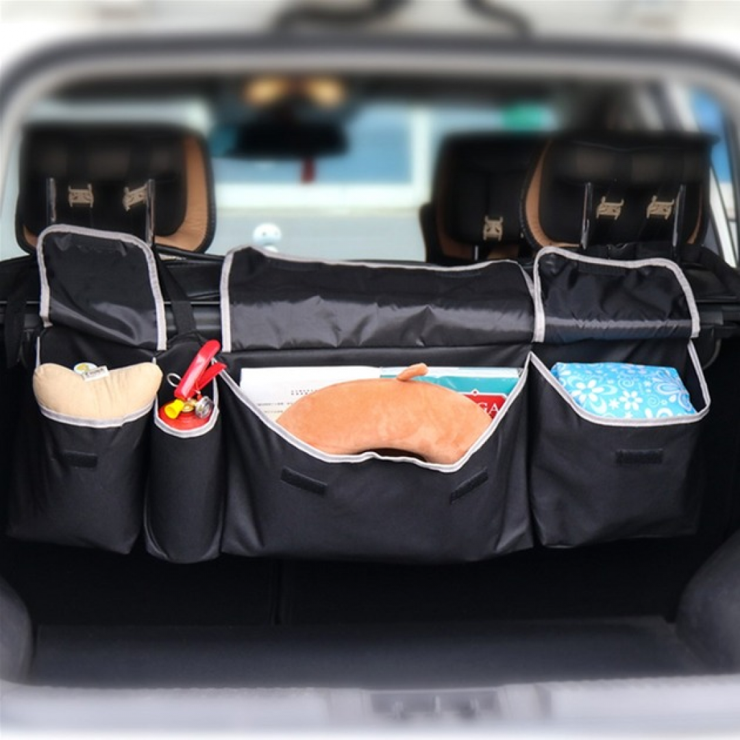 Подвесной органайзер для багажника автомобиля — удобное и практичное решение для поддержания порядка и рационального использования пространства. Изделие оснащено четырьмя вместительными отделениями, включая одно большое и три меньших, каждое из которых закрывается клапаном на липучке. Органайзер крепится к подголовникам задних сидений при помощи прочных ремней с застёжками, не занимая место на полу багажника.