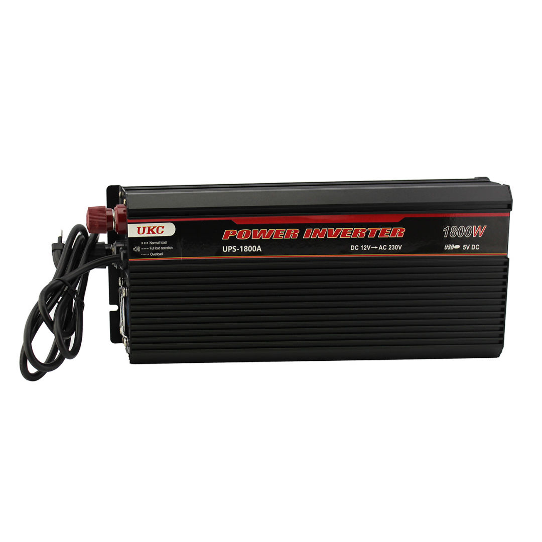 Инвертор UKC AC/DC UPS 1800W предназначен для преобразования постоянного напряжения 12 В в переменное напряжение 220–230 В. Устройство позволяет подключать нагрузку мощностью до 1800 Вт, что делает его подходящим для питания электроинструмента, бытовой техники, аудио- и видеоустройств, ноутбуков, телефонов и другого оборудования.