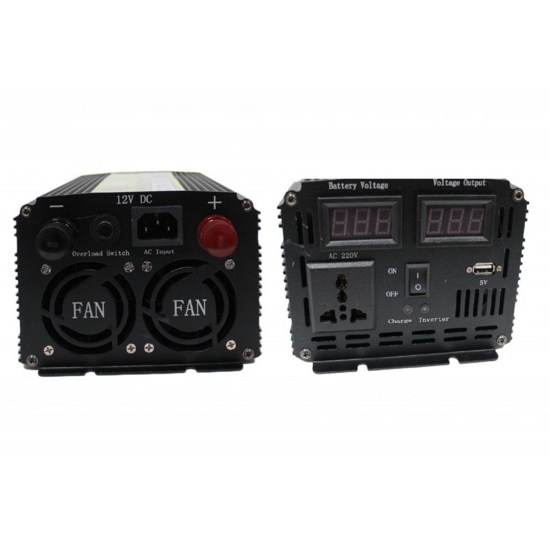 Одной из ключевых особенностей инвертора является встроенная зарядка аккумулятора 12 В на 15 А от сети 220 В, что позволяет использовать устройство как источник бесперебойного питания без необходимости покупки отдельного зарядного устройства. Корпус выполнен из алюминия, оснащён двумя вентиляторами, индикаторами, двумя вольтметрами, USB-портом и универсальной розеткой 220 В.