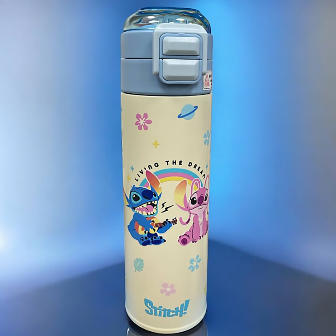 Детский термос объёмом 520 мл предназначен для хранения горячих и холодных напитков. Модель оснащена встроенной трубочкой и поильником, размещёнными под защитной откидной крышкой с фиксатором. Корпус украшен изображениями персонажей Stitch в ярком мультяшном стиле.