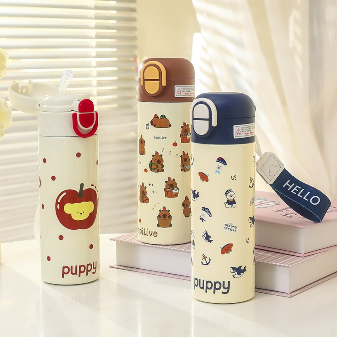 Корпус термоса украшен тематическими рисунками (unicorn, kapibara, puppy), выполненными в мягких пастельных оттенках. Внутренняя колба изготовлена из нержавеющей стали 304, а дно — из стали 316.