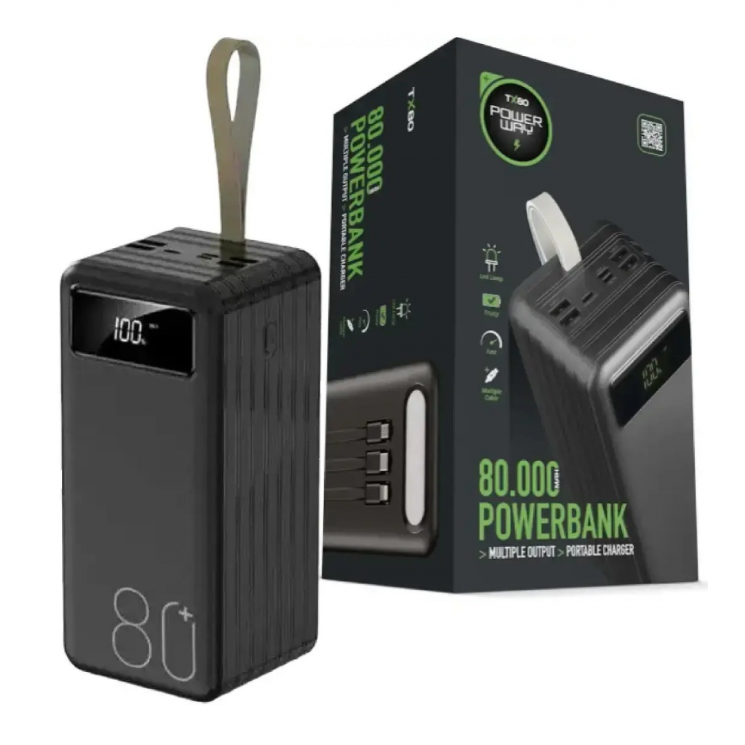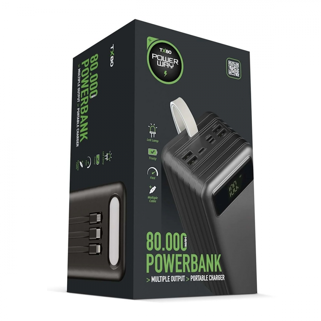 Портативный аккумулятор Power Way TX80, 80 000 мА·ч, с встроенными кабелями и фонарем