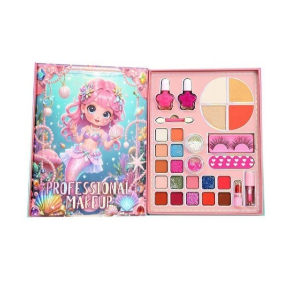 Детский косметический набор V6421 выполнен в ярком стиле с изображением русалочки и оформлен как раскладная палетка. Набор включает тени разных оттенков, блестящие текстуры, хайлайтер, румяна и декоративные элементы. Такой комплект предназначен для ролевых игр, позволяя ребёнку развивать воображение и творческие навыки.