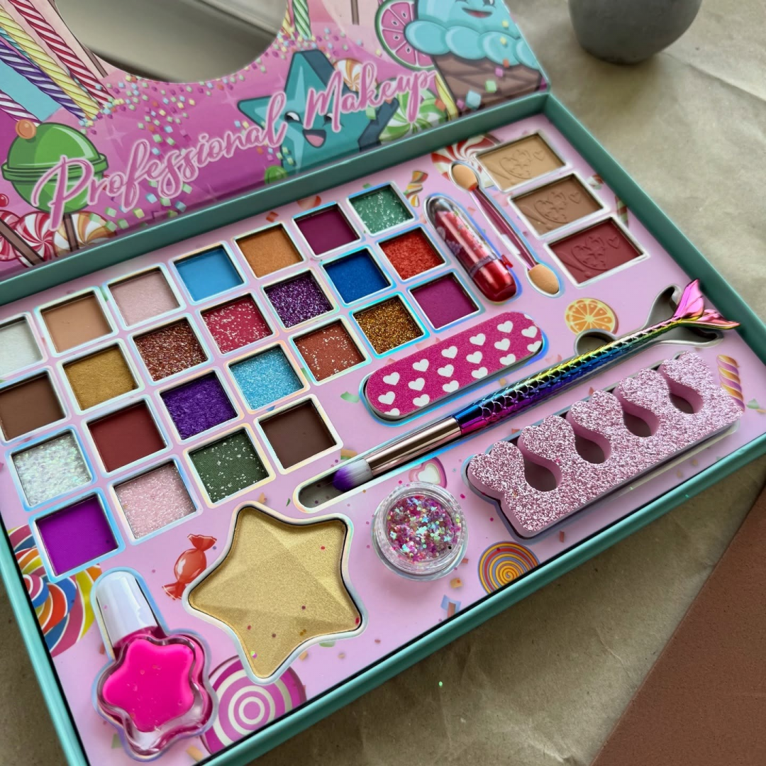 Палетка раскладывается, открывая доступ к зеркалу и всем отделениям. Внутри размещаются тени различных цветов, глиттеры, мини-аксессуары, декоративные лаки и элементы в виде фигурок. Благодаря компактным размерам и продуманной компоновке набор удобен для хранения и использования.