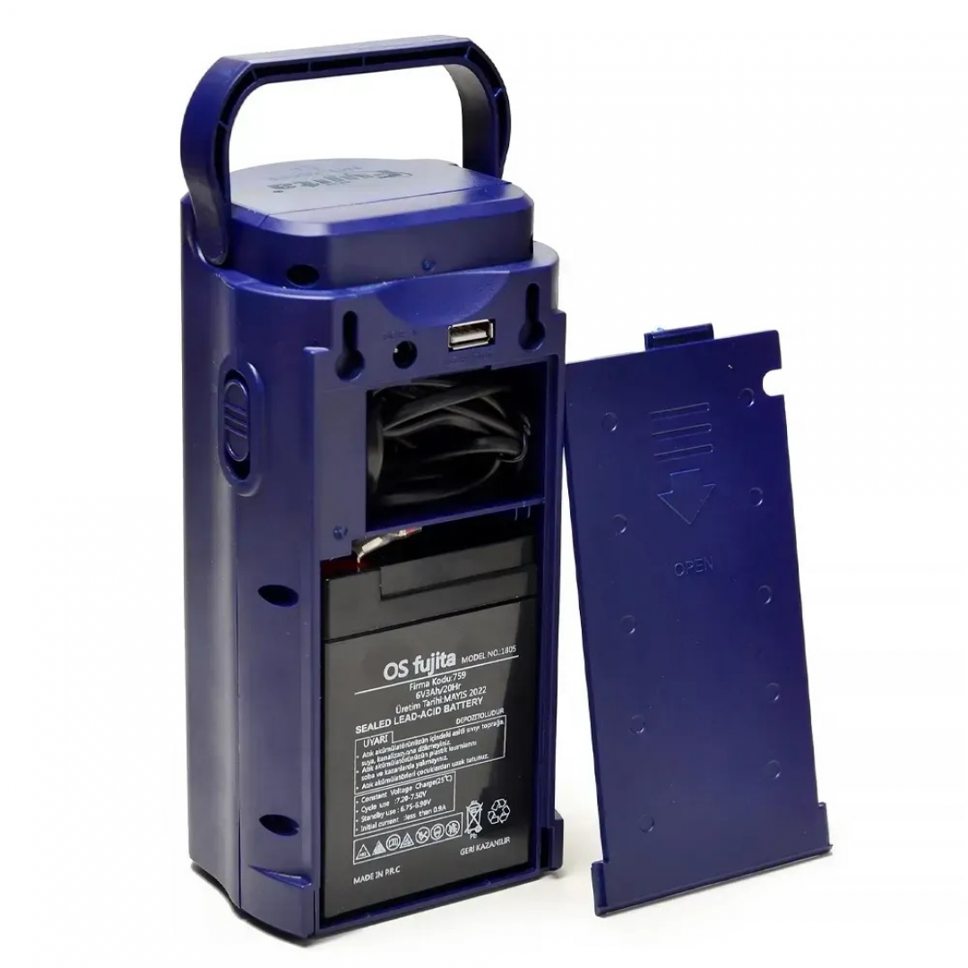 Фонарь имеет встроенный аккумулятор и функцию повербанка, позволяющую заряжать мобильные устройства. Корпус выполнен из пластика, предусмотрена ручка для удобной переноски. Поддерживает два режима освещения.