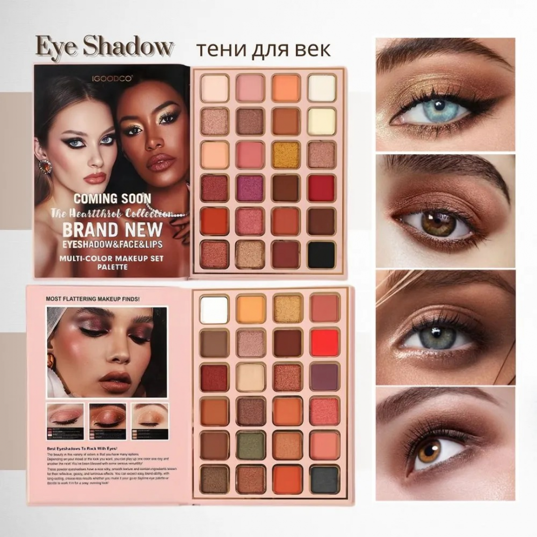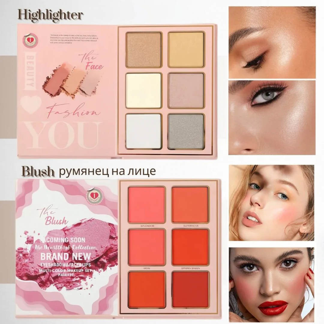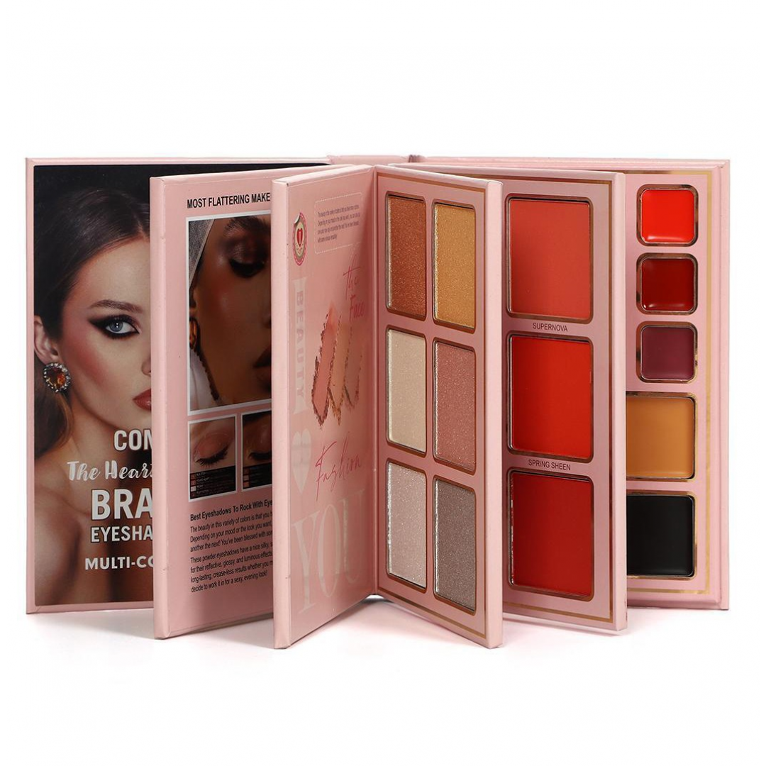 Палетка выполнена в формате книги с несколькими раскрывающимися секциями. Все продукты имеют сухую текстуру и предназначены для нанесения на разные зоны лица.