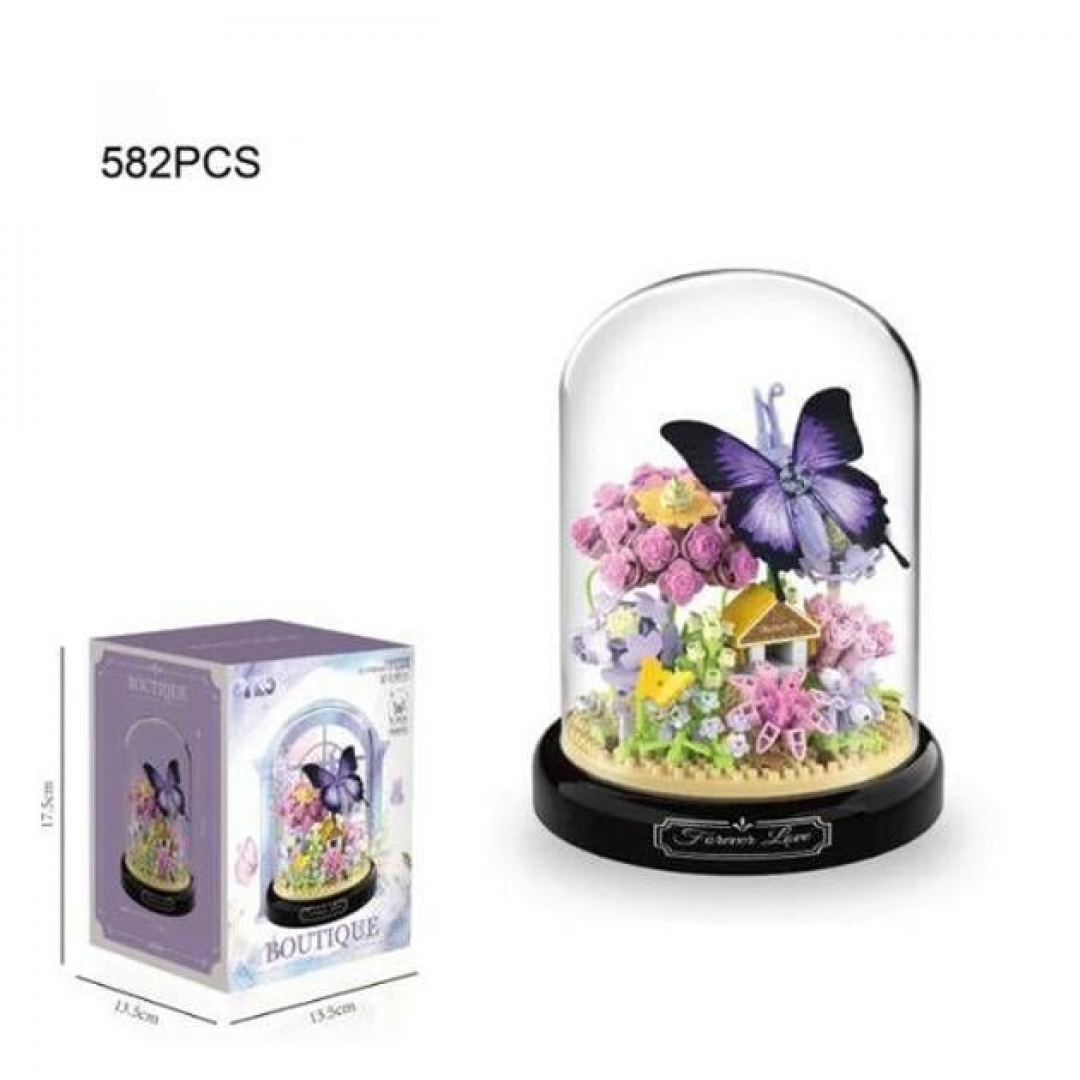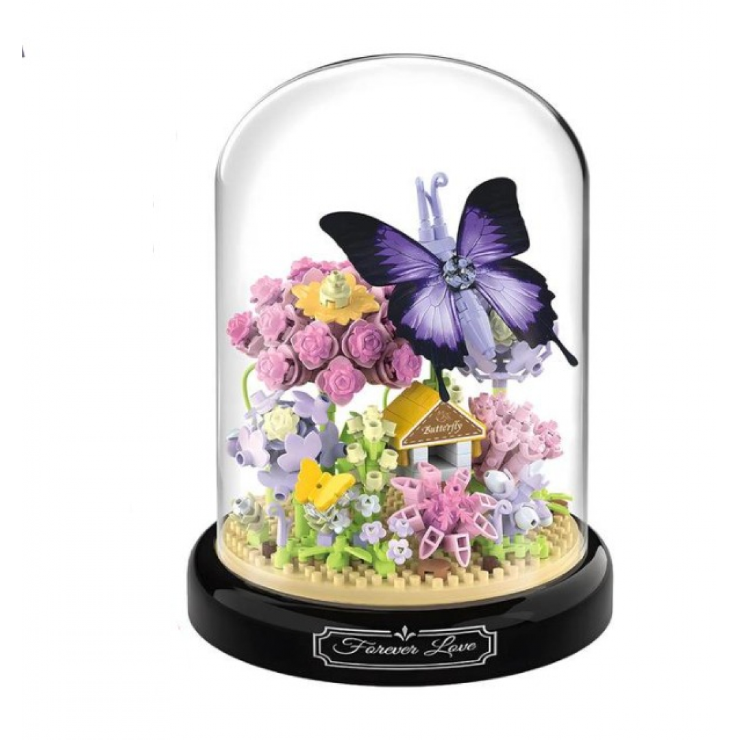 Конструктор представляет собой декоративную 3D-композицию с цветами и бабочкой, размещённую под прозрачной защитной колбой. Модель собирается из мини-деталей и предназначена для самостоятельной сборки с последующим использованием в качестве интерьерного украшения.