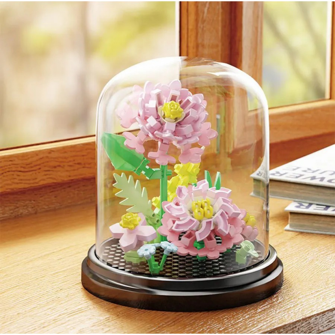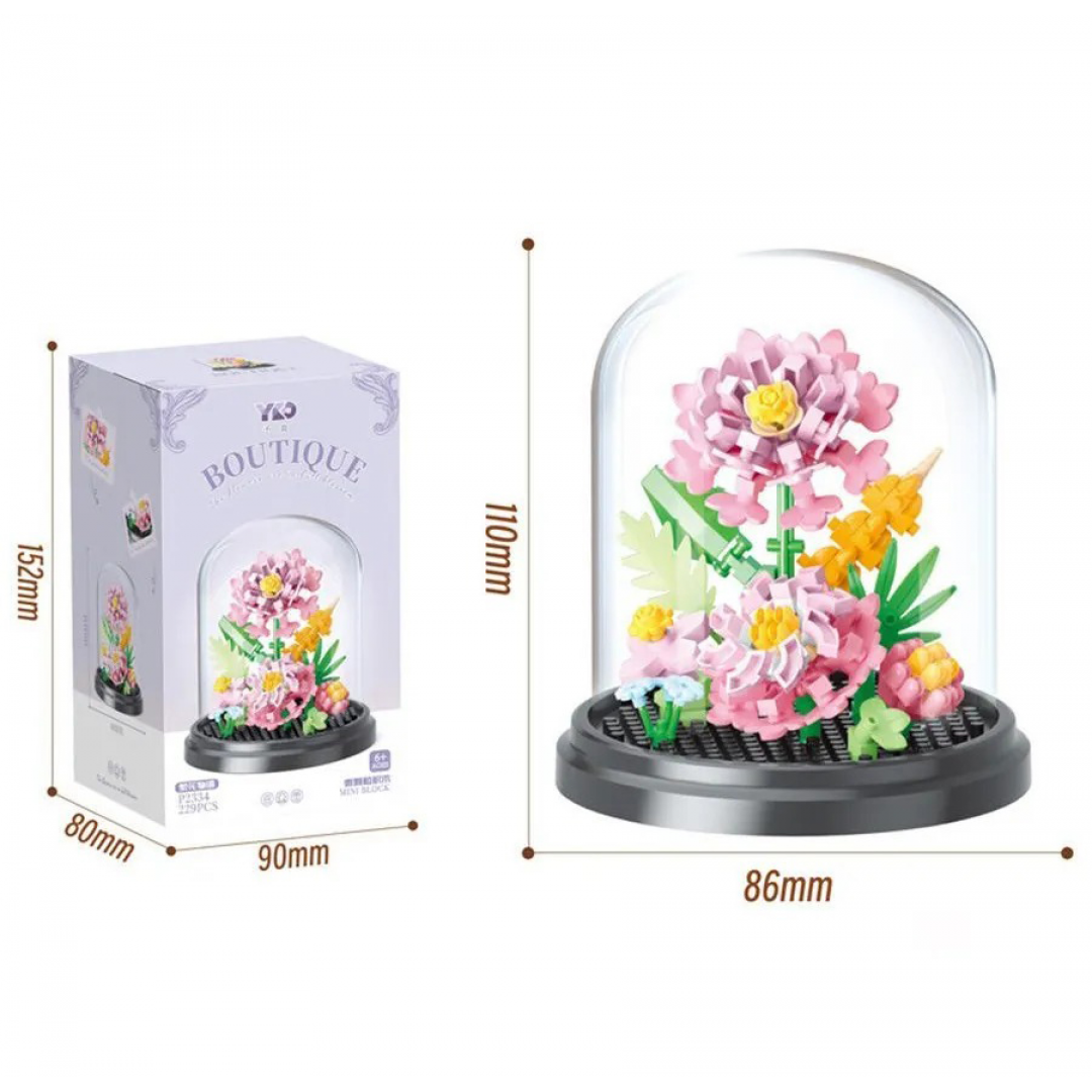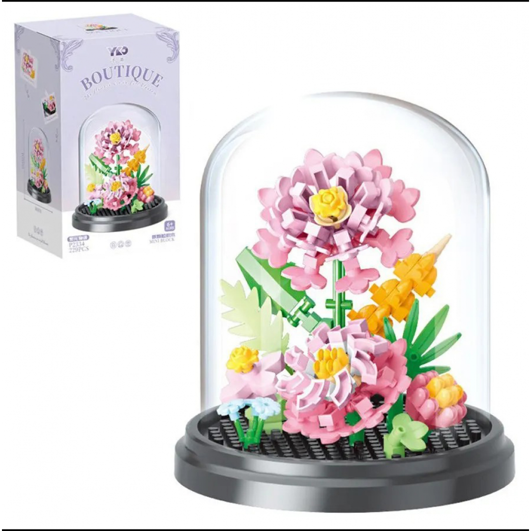Конструктор представляет собой декоративную композицию из цветов, собранную из пластиковых мини-деталей и размещённую под прозрачной защитной колбой. Модель предназначена для самостоятельной сборки и последующего использования в качестве интерьерного украшения.