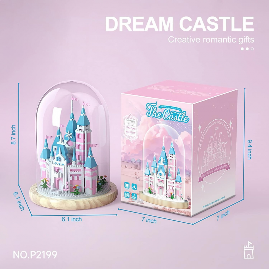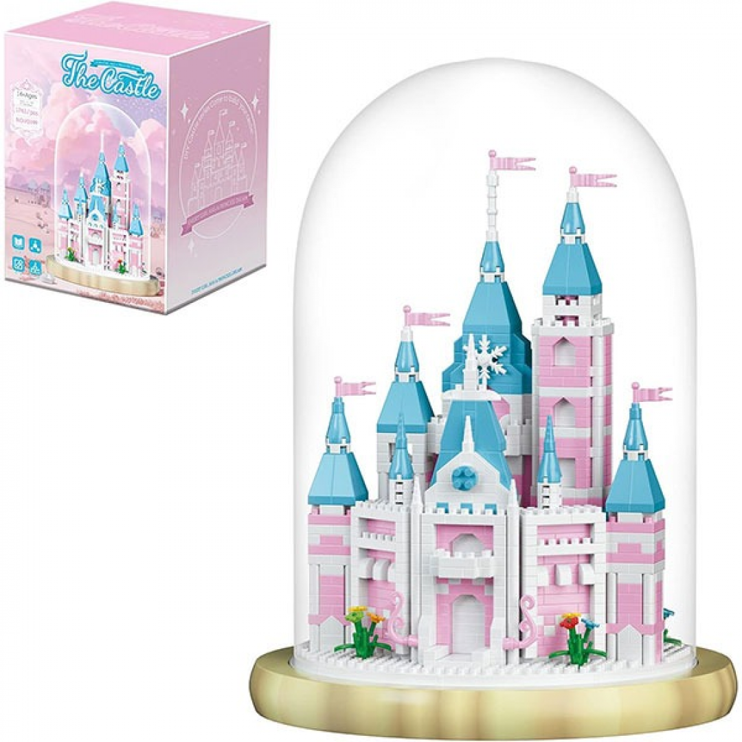 Конструктор представляет собой детализированную архитектурную композицию в виде розового замка, выполненного из пластиковых деталей и размещённого под прозрачным пылезащитным куполом. Модель предназначена для самостоятельной сборки и последующего использования в качестве декоративного элемента интерьера.