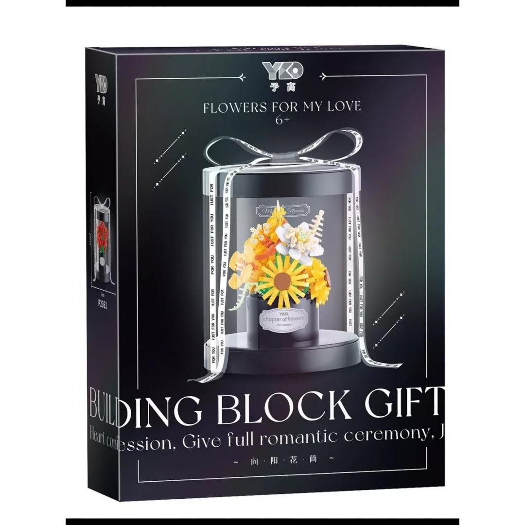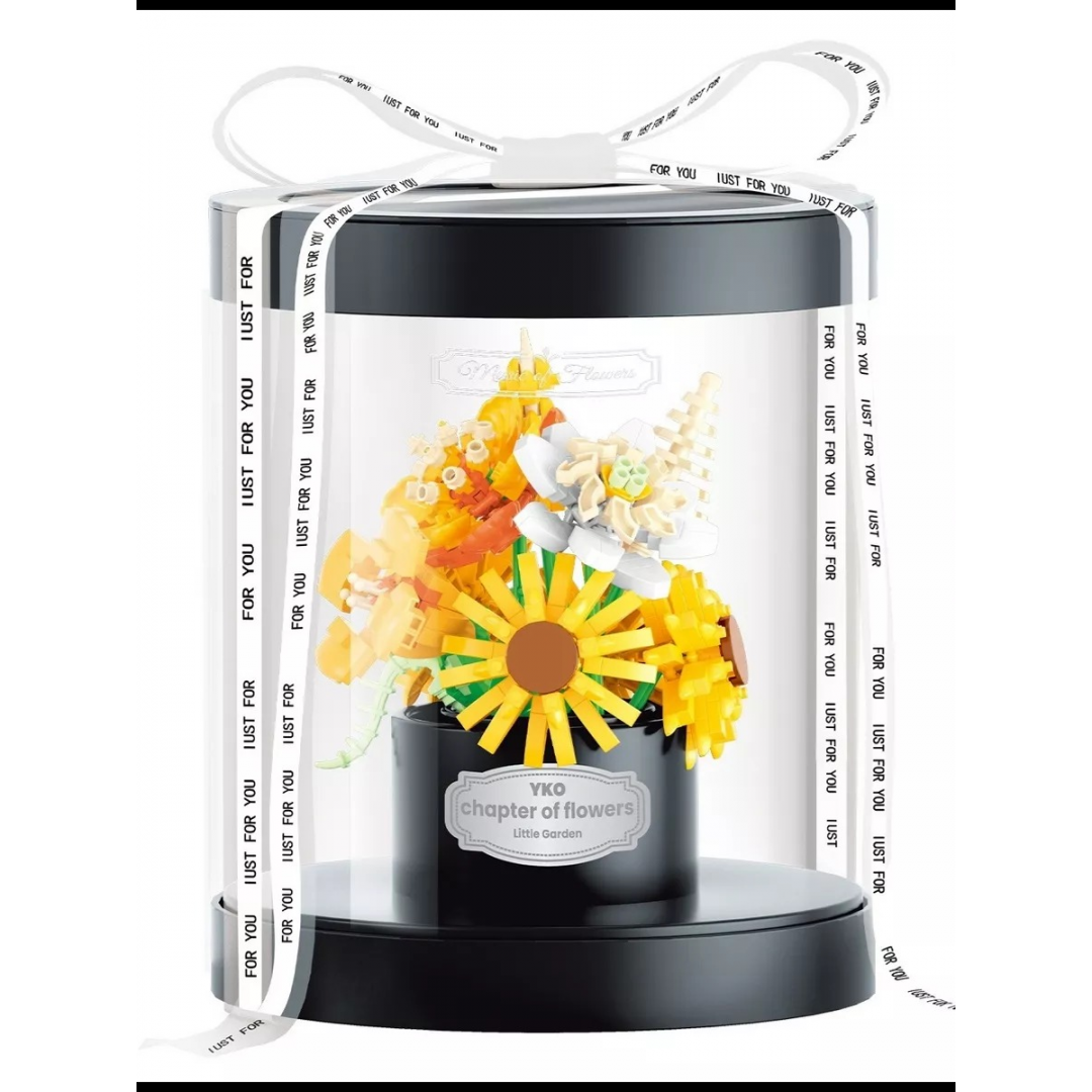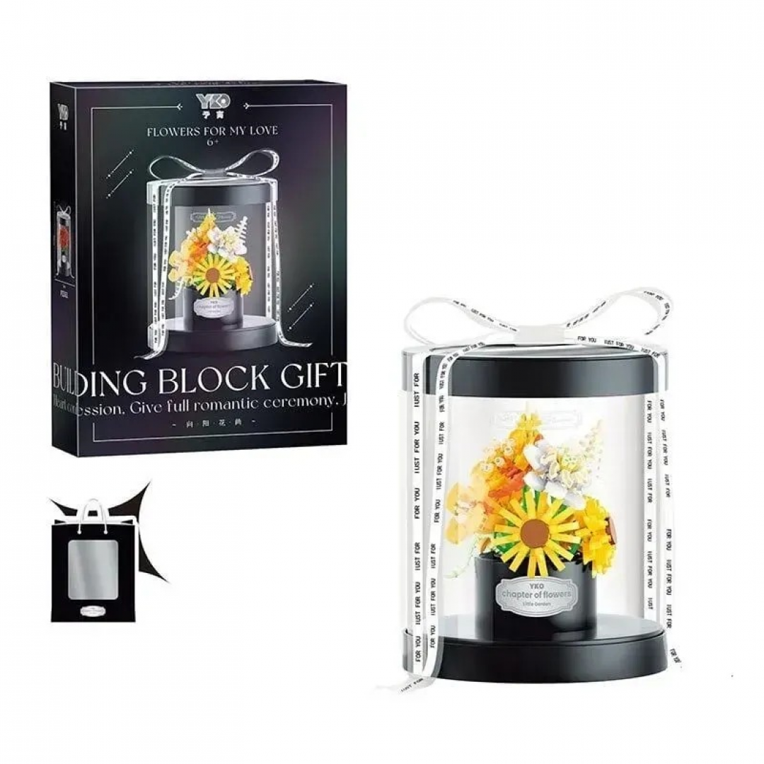 Подарочный набор представляет собой декоративную композицию с цветочным букетом, собранным из пластиковых элементов и размещённым под прозрачным куполом. Модель предназначена для самостоятельной сборки и последующего использования в качестве интерьерного украшения.