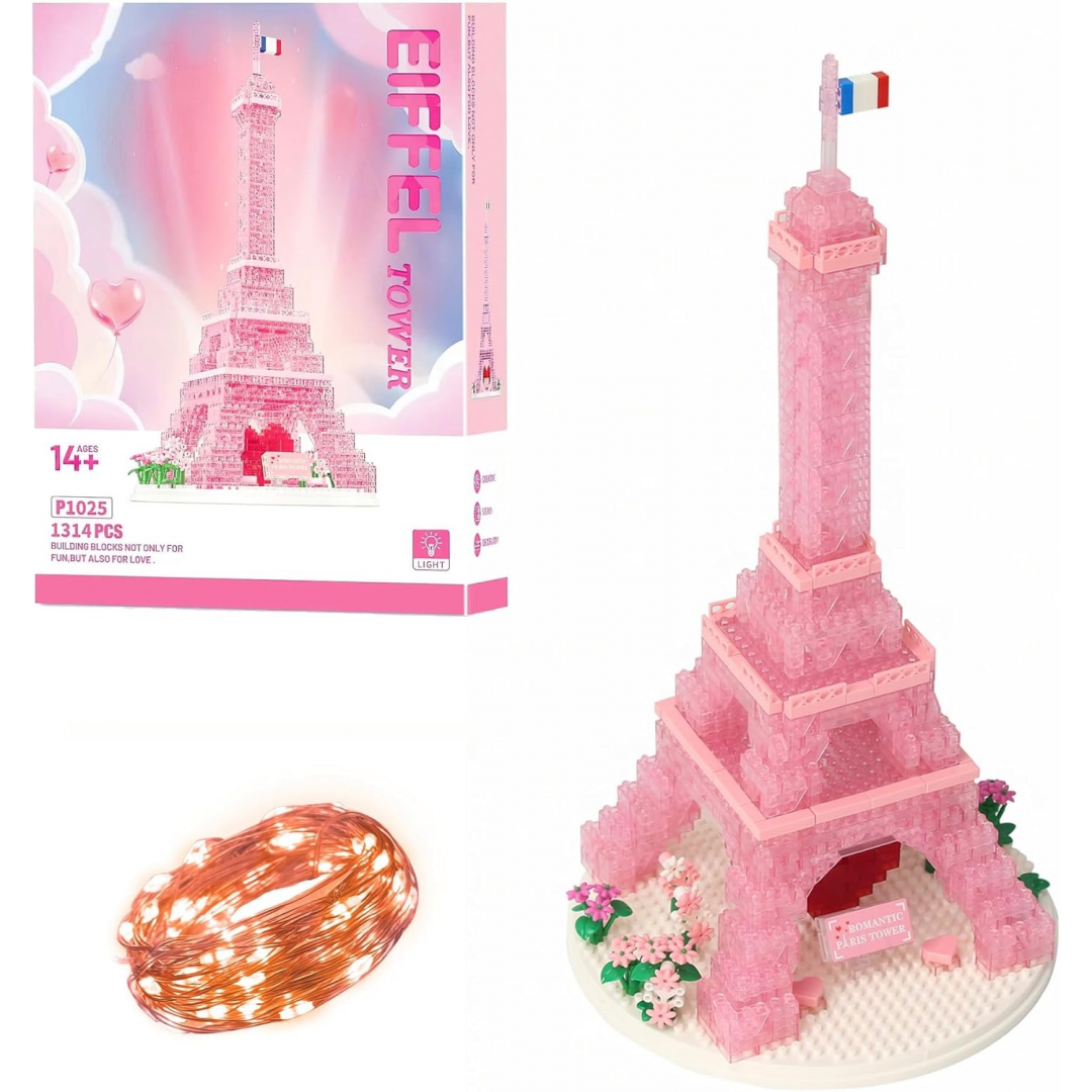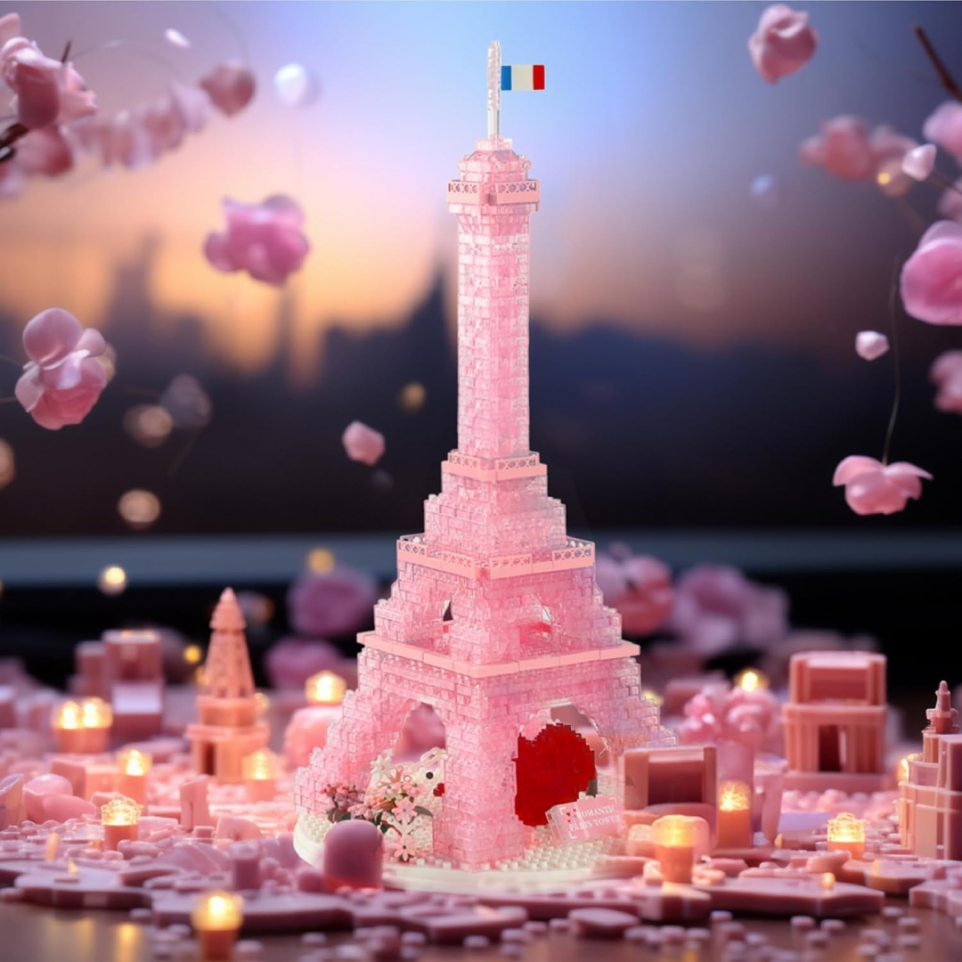 Декоративный конструктор в виде Эйфелевой башни, выполненный из полупрозрачных розовых элементов. Модель оснащена светодиодной подсветкой, создающей мягкое декоративное освещение. После сборки используется как интерьерный элемент.