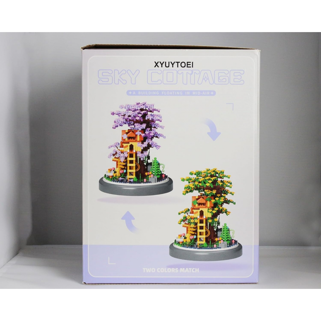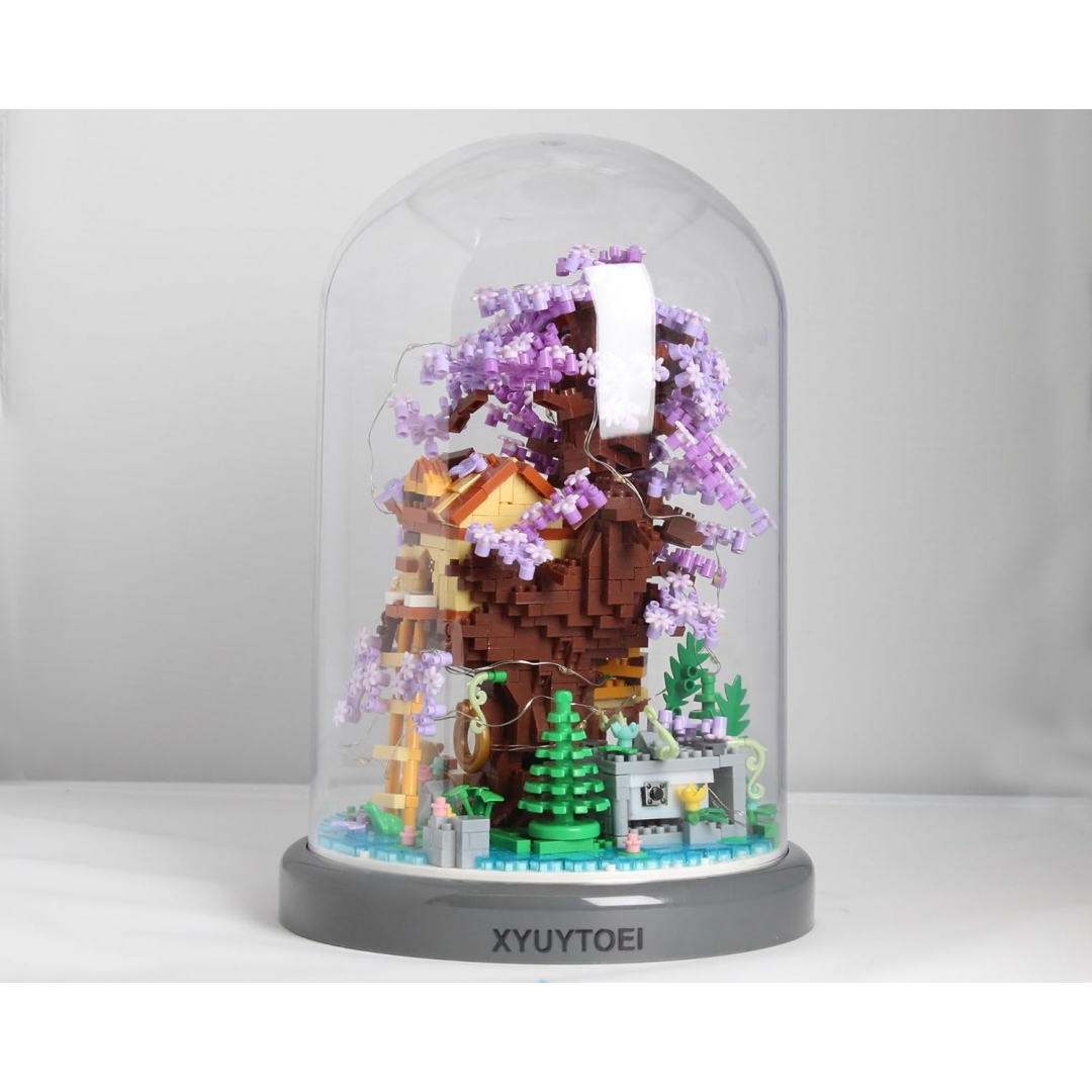 Декоративный конструктор в виде домика на дереве, размещённого на круглой подставке и закрытого прозрачной защитной колбой. Модель представляет собой детализированную сцену с домиком, лестницей, террасами, декоративными элементами и окружающим ландшафтом. Конструкция рассчитана на сборку из большого количества мелких деталей и предназначена для создания интерьерной композиции.