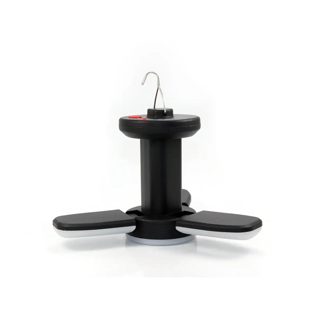 Многофункциональный перезаряжаемый кемпинговый фонарь в формате складной лампы с тремя поворотными лопастями. Лепестки раскладываются на 90 градусов, увеличивая площадь и интенсивность освещения, либо складываются в компактный ручной фонарь для удобства переноски.