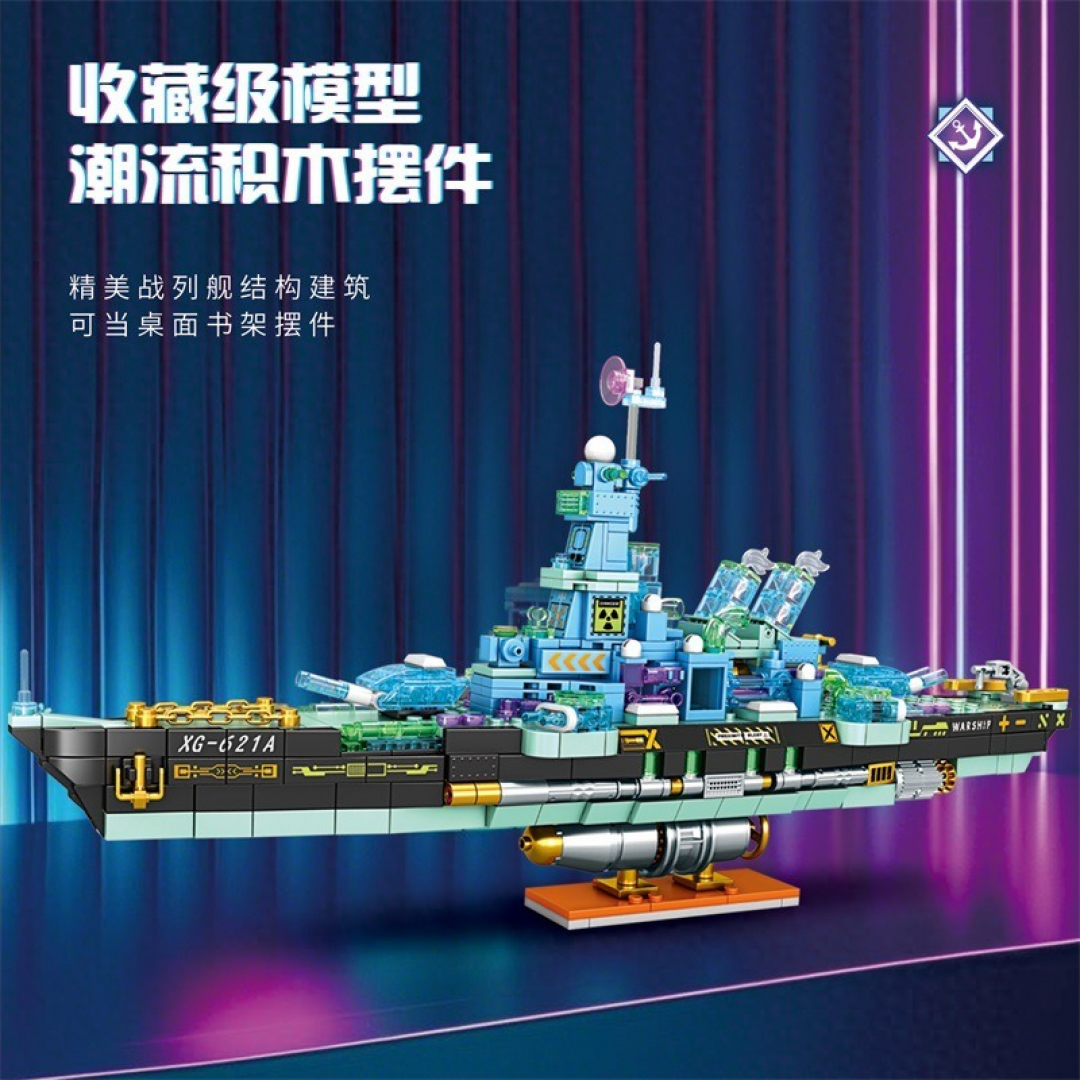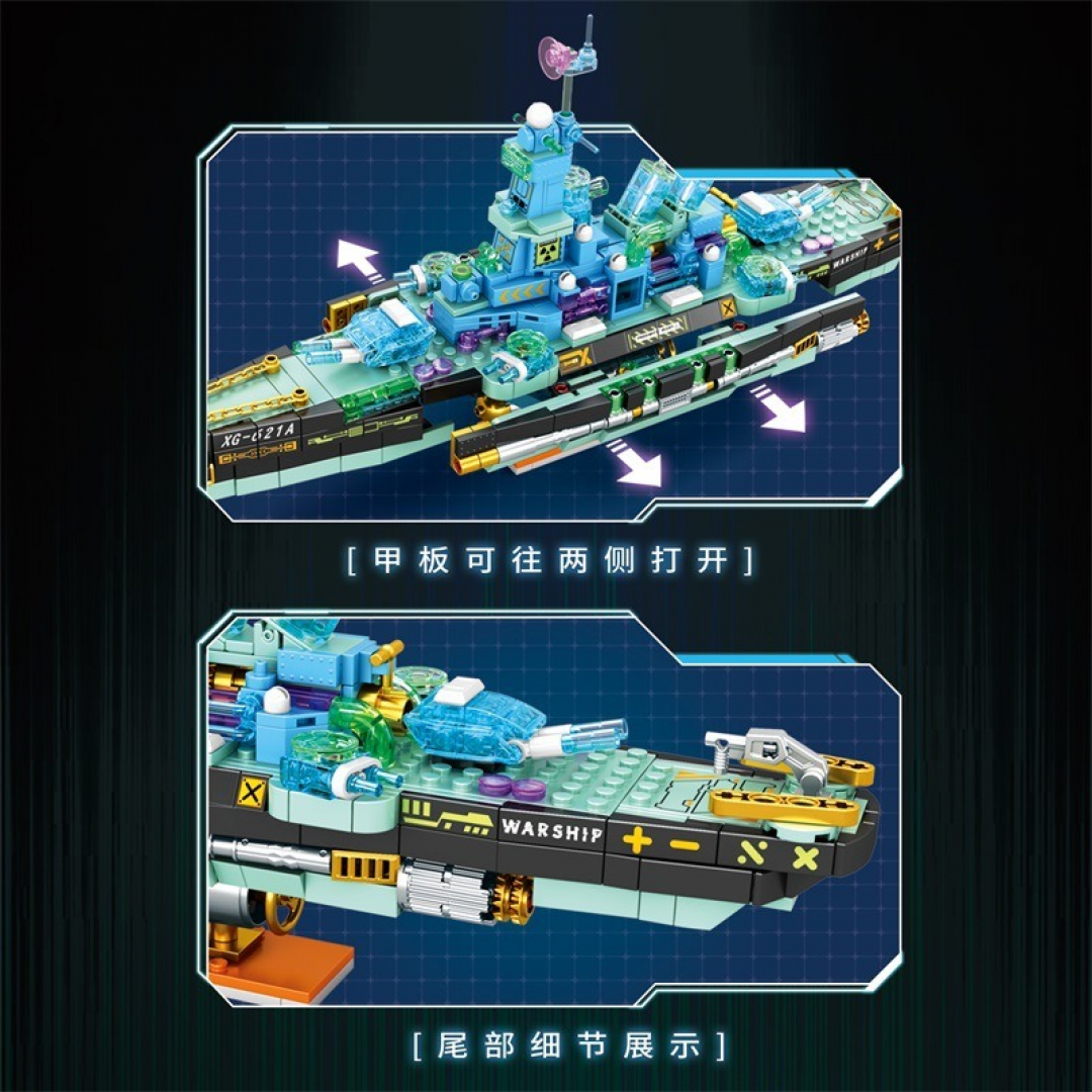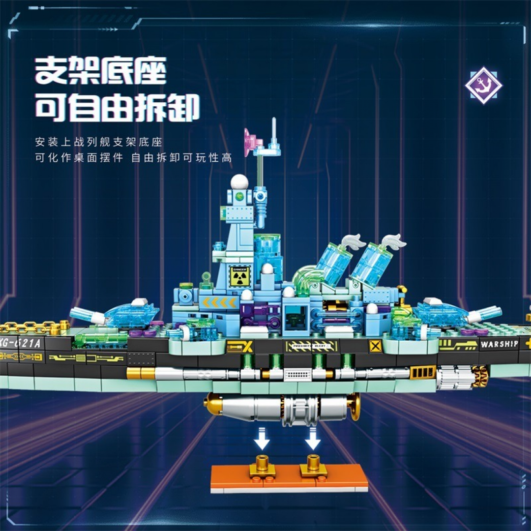 Конструктор «Военный корабль» представляет собой сборную модель боевого корабля в футуристическом стиле. Модель выполнена с акцентом на технические элементы корпуса, вооружение, надстройки и палубные детали. Конструкция включает подставку, что позволяет использовать готовую модель как настольную композицию.