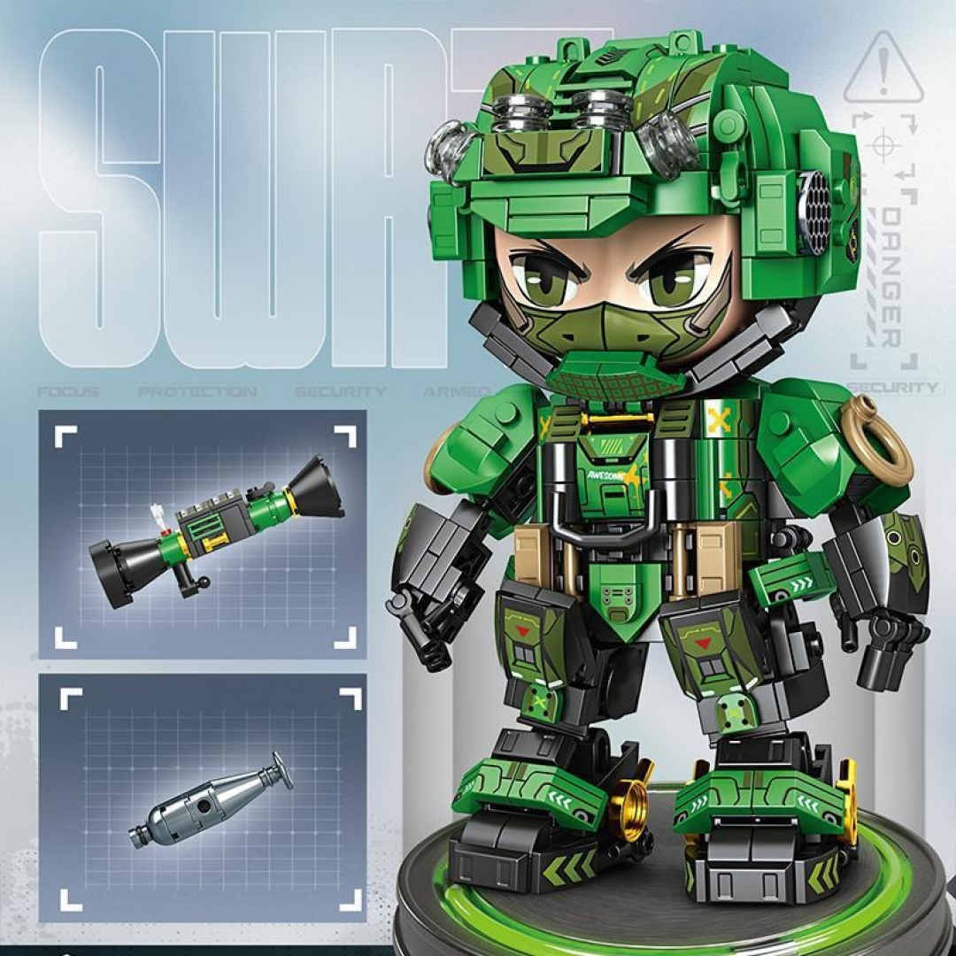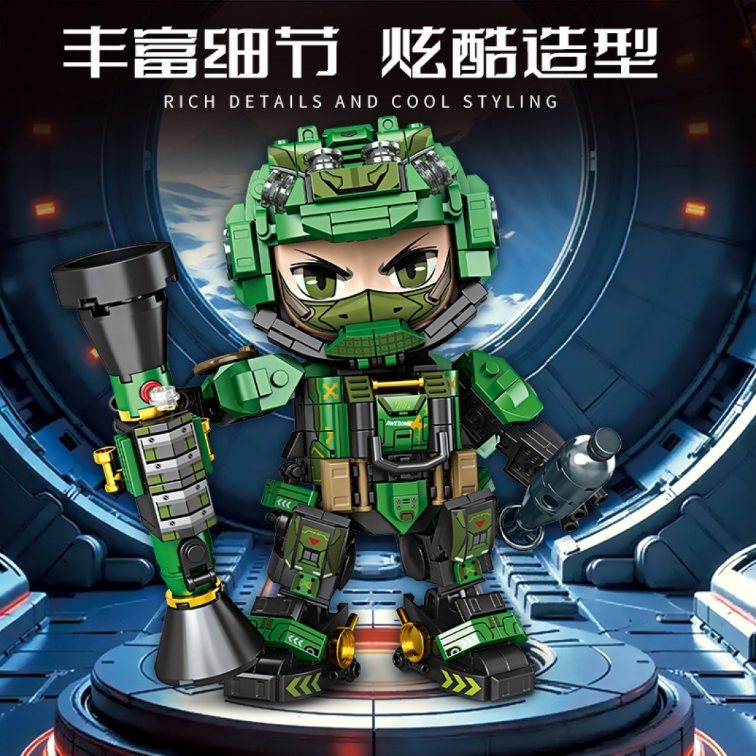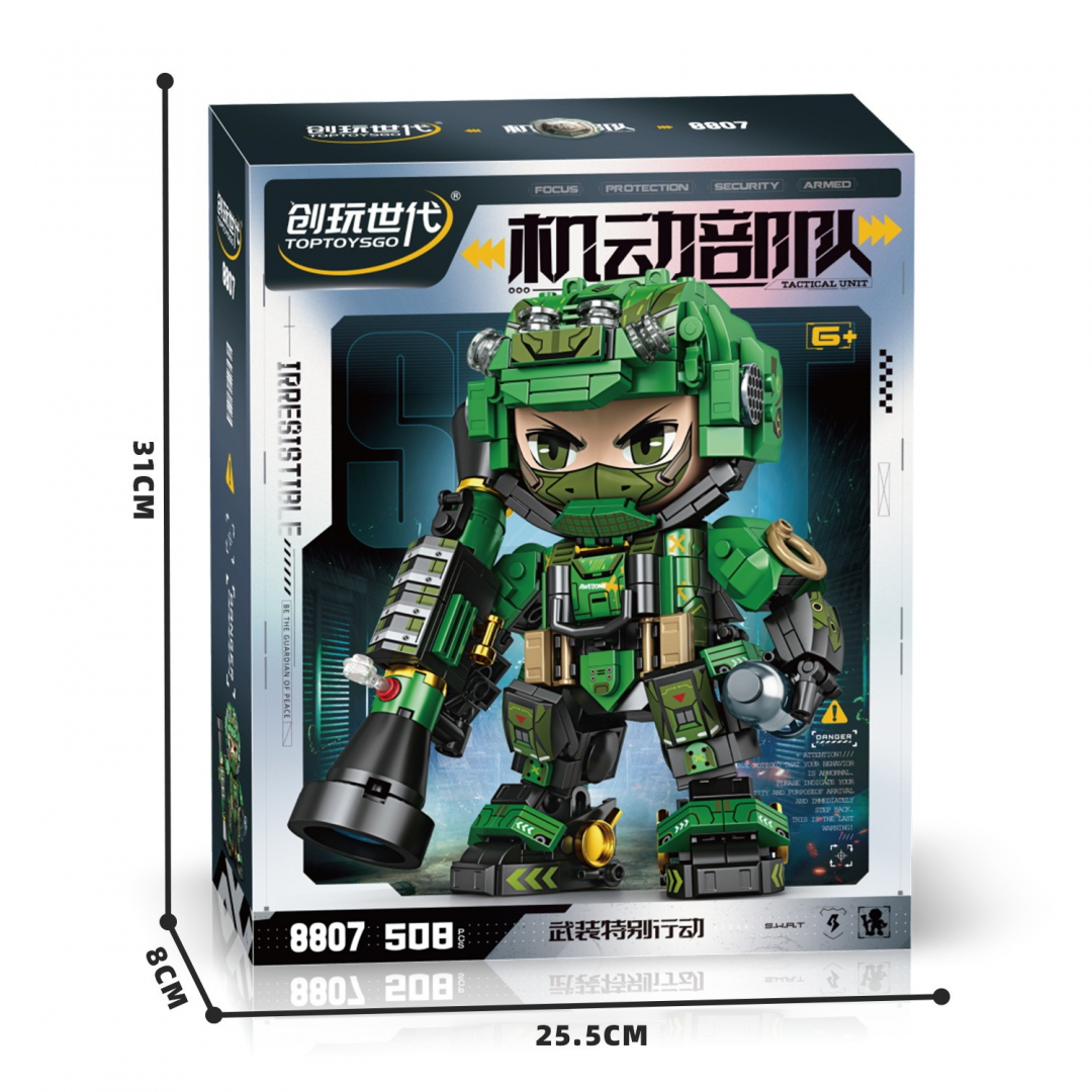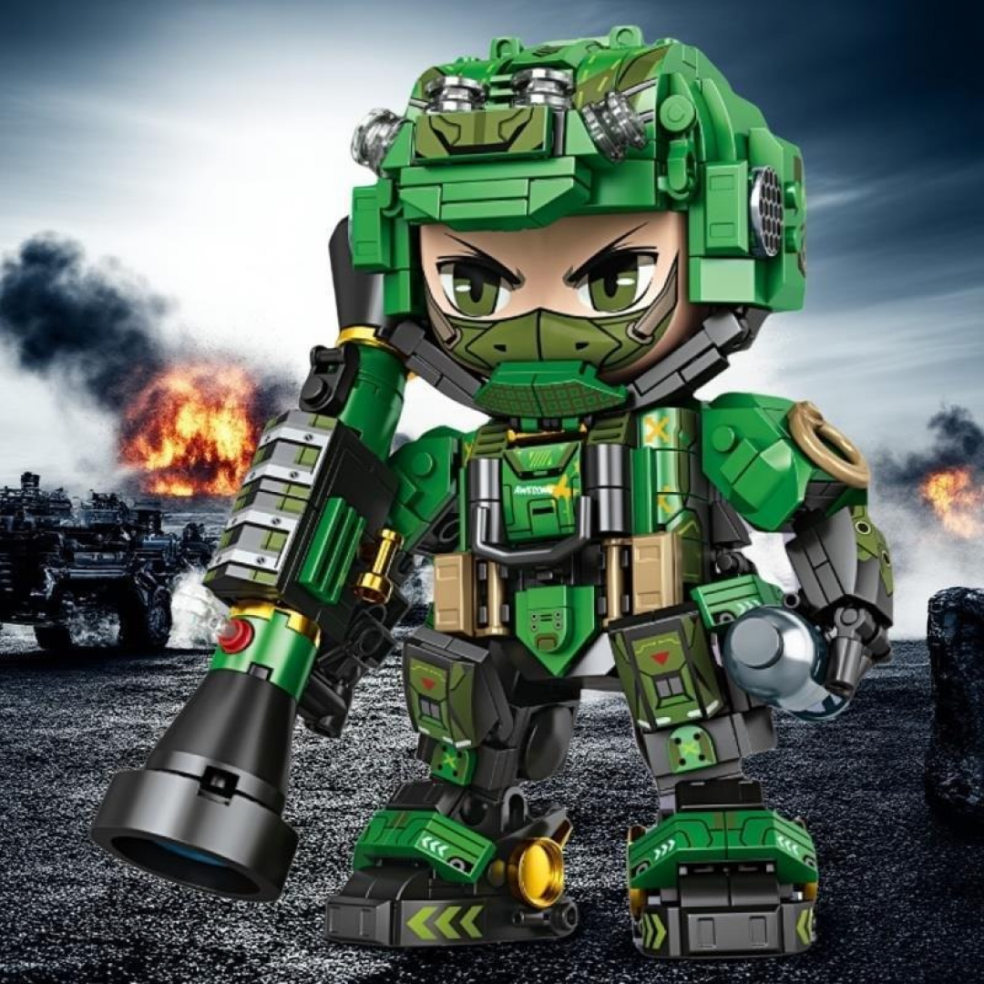 Конструктор представляет собой сборную модель бойца мобильного военного отряда в тактической экипировке. Фигурка выполнена в стилизованном формате с увеличенной головой и детализированным снаряжением. Конструкция собирается из отдельных элементов и предназначена для поэтапной сборки.