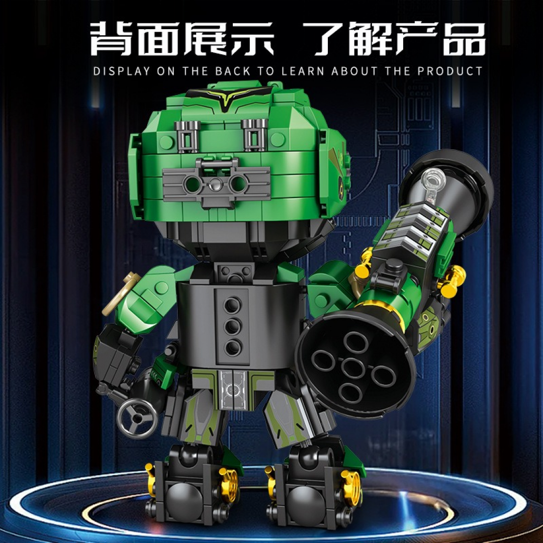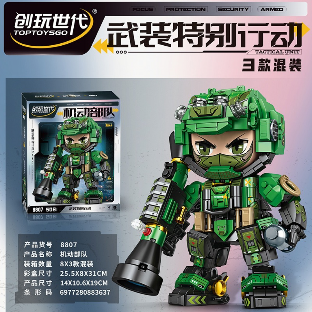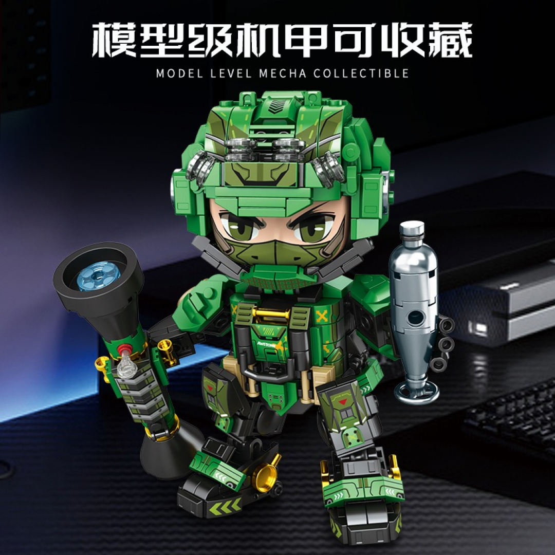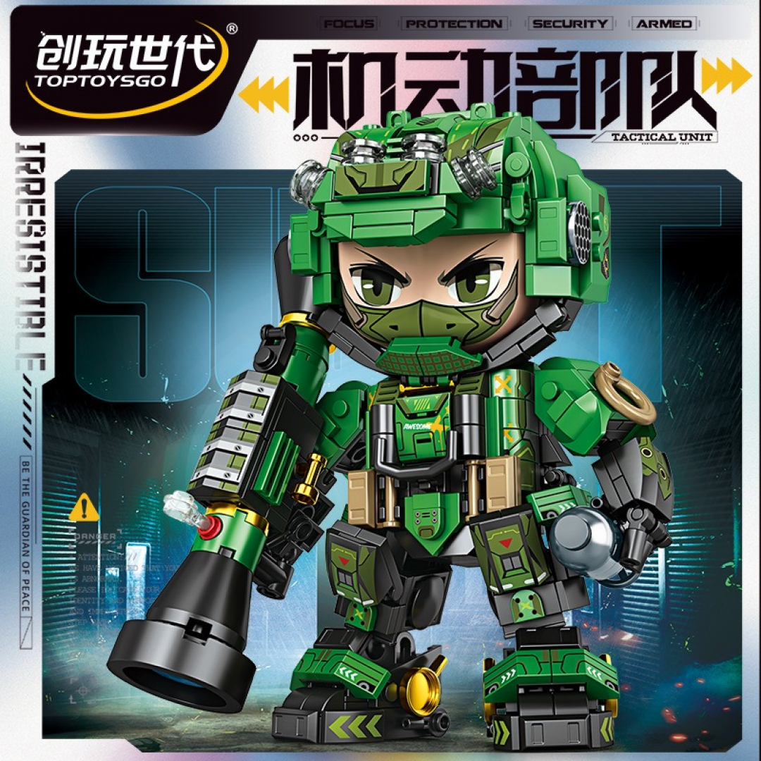 Конструктор представляет собой сборную модель бойца мобильного военного отряда в тактической экипировке. Фигурка выполнена в стилизованном формате с увеличенной головой и детализированным снаряжением. Конструкция собирается из отдельных элементов и предназначена для поэтапной сборки.