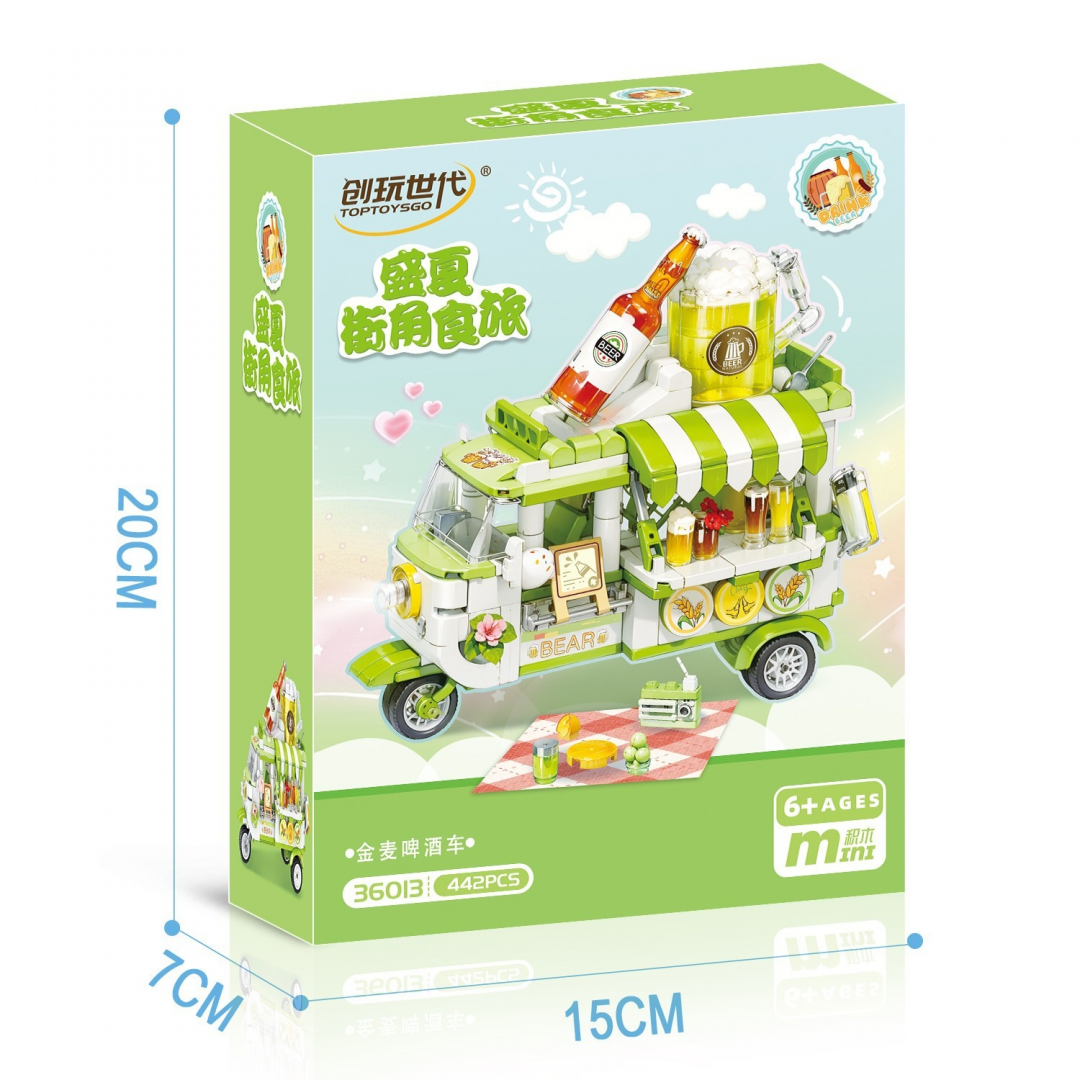 Конструктор представляет собой сборную модель тематического фудтрака в виде машины с напитками. В готовом виде модель выполнена в формате уличного торгового транспорта с навесом, витриной и декоративными элементами, имитирующими подачу напитков. Конструкция ориентирована на детализированную сборку и сюжетную игру.