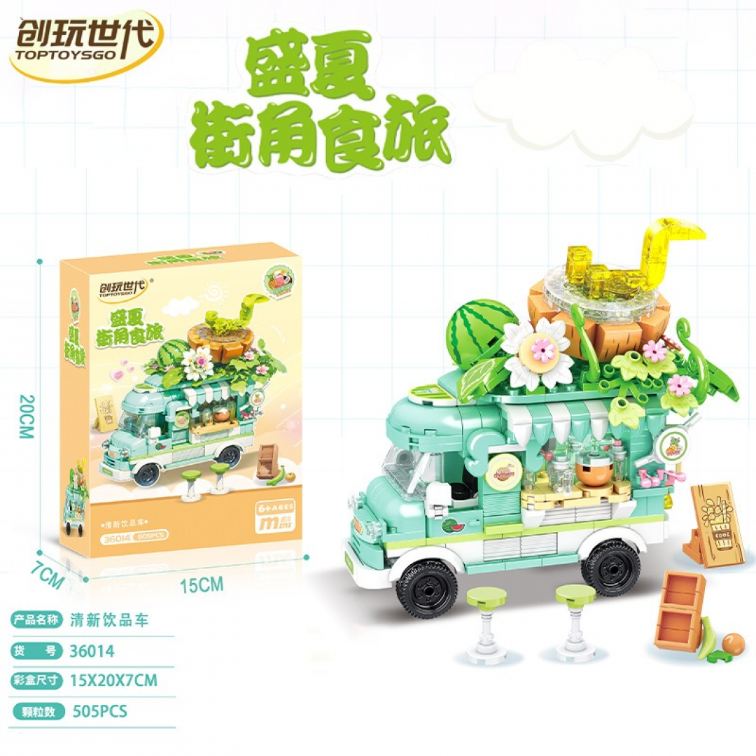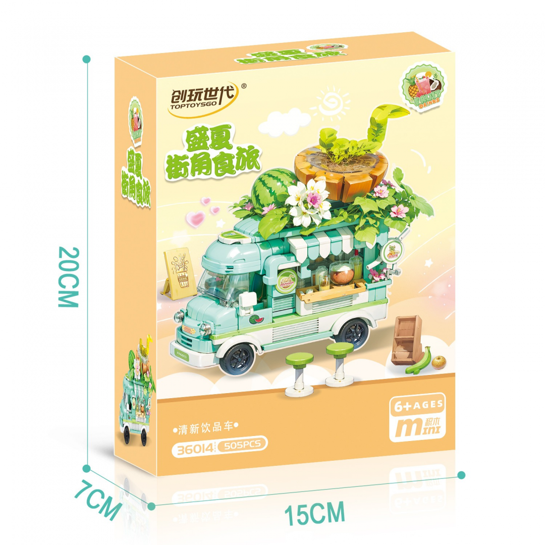 Конструктор представляет собой сборную модель уличной торговой машины, оформленной в тематике прохладительных напитков. В собранном виде модель выполнена в виде фудтрака с навесом, витриной и декоративными элементами, имитирующими приготовление и продажу напитков.