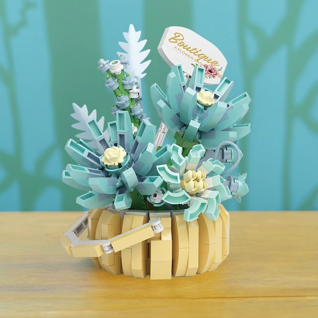 Конструктор представляет собой декоративную композицию в виде цветочной корзины с объемными цветами и растительными элементами, выполненными в холодной бирюзово-зелёной цветовой гамме. Модель собирается из отдельных пластиковых деталей и предназначена для создания интерьерного декоративного объекта.